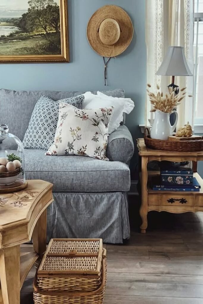 Soft blues provide a calm, airy feel in farmhouse living rooms. Use light blue walls, pillows, or rugs to contrast with warm wood tones. This palette creates balance, making the room feel serene yet connected to natural textures. Cottage-inspired blue works well for coastal or countryside homes, blending tranquility with farmhouse warmth.