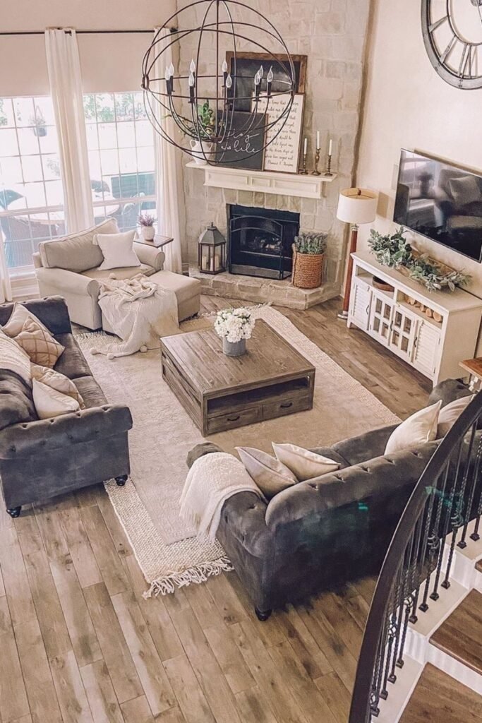 Fireplaces are central to farmhouse living rooms. Stone or brick fireplaces provide a natural focal point. Surround with neutral furniture and warm textiles to highlight the hearth. A simple mantle can display minimal décor, maintaining clean lines while adding character. The fireplace draws the eye and anchors the room.