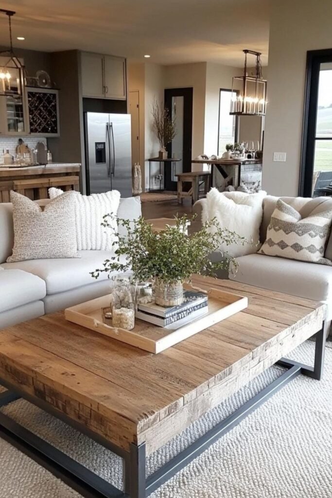 Combining modern lines with earthy tones creates balance in farmhouse living rooms. Neutral walls, wooden furniture, and muted greens or browns provide grounding. Modern furniture pieces with clean lines contrast with textured rugs or rustic accents. This approach keeps the space fresh while staying true to farmhouse roots.