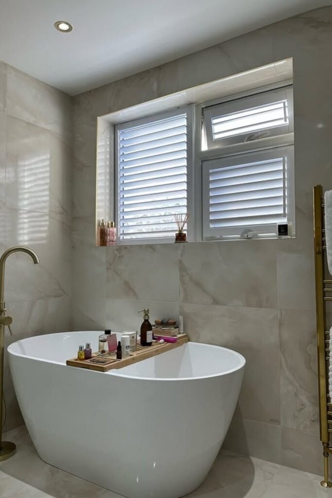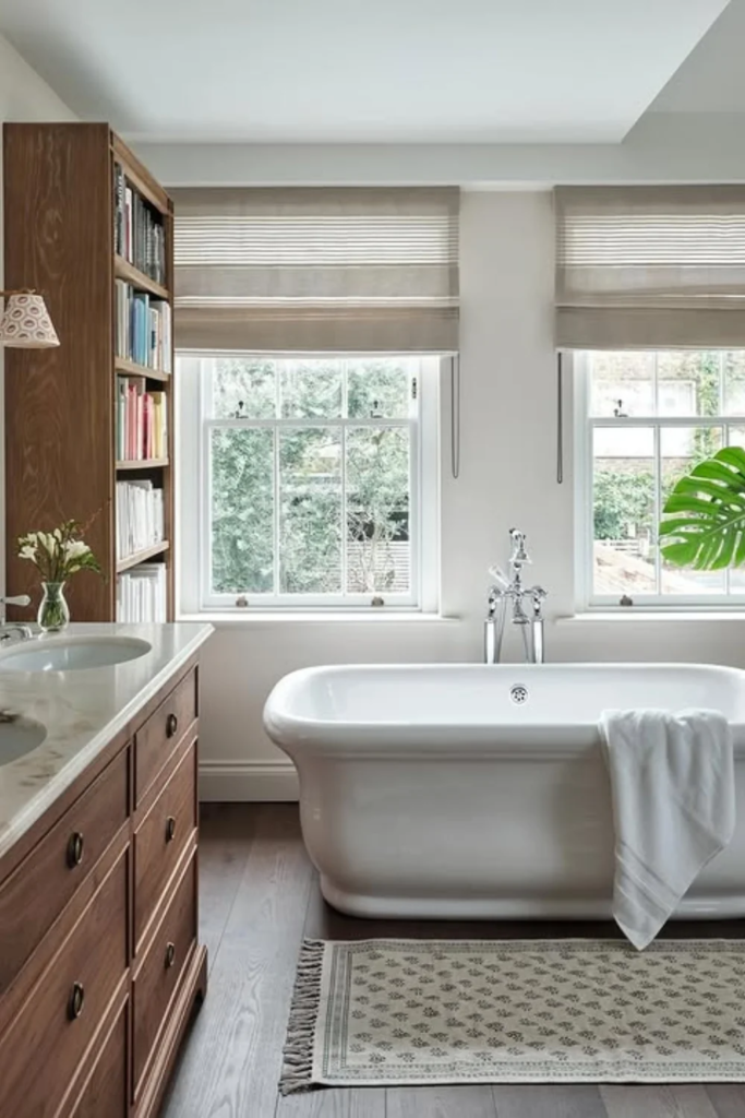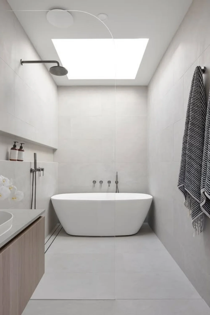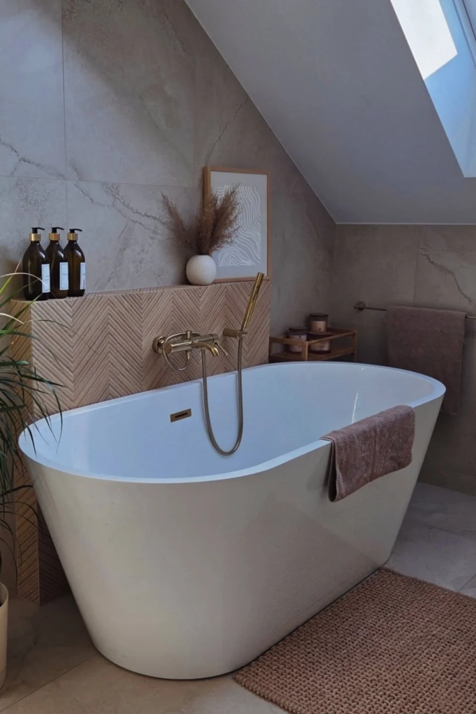 Natural light changes how a bathroom feels. Placing a freestanding tub under a skylight or near a high window creates a calm bathing experience. Light from above highlights the tub shape and adds softness. This idea works in both modern and traditional homes and improves mood without extra cost.