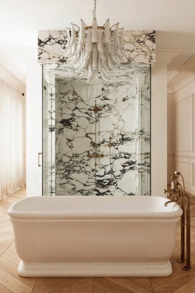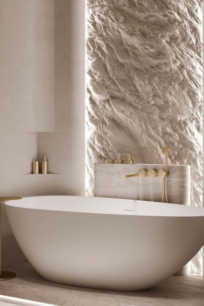 Some bathrooms need a strong center point. A freestanding tub placed under a feature light or against a textured wall can create impact without feeling loud. The key is control. One bold element is enough. In 2026 designs, this often means pairing a smooth tub with a darker wall or stone surface. The contrast adds depth while keeping the space grounded and usable.