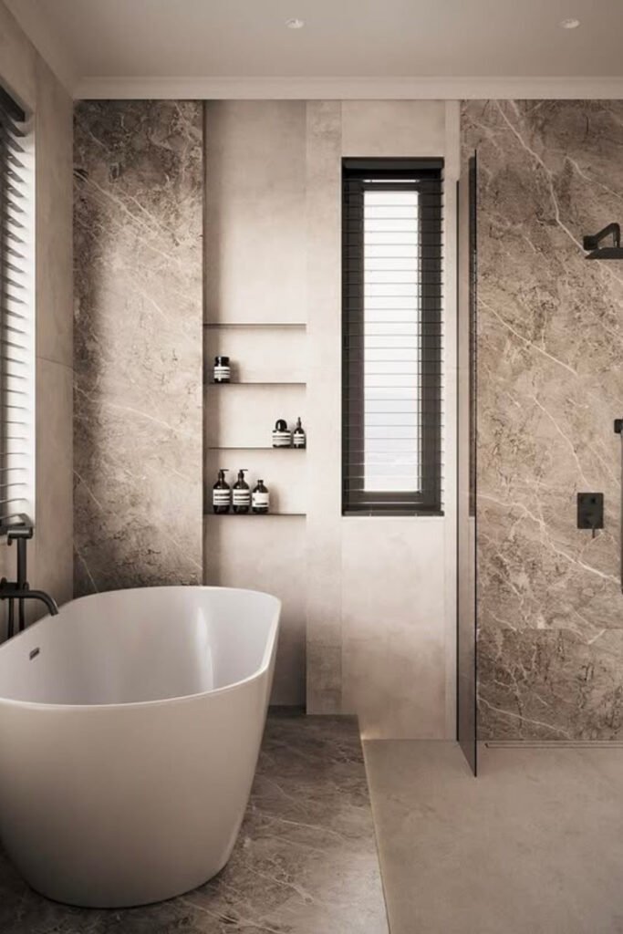Some tubs are designed to be seen. Sculptural shapes with smooth curves or strong lines turn the tub into a design feature. This works best in larger bathrooms where the tub has space to breathe. The rest of the room stays simple to avoid distraction. This idea is less about trend and more about form, making it age well over time.