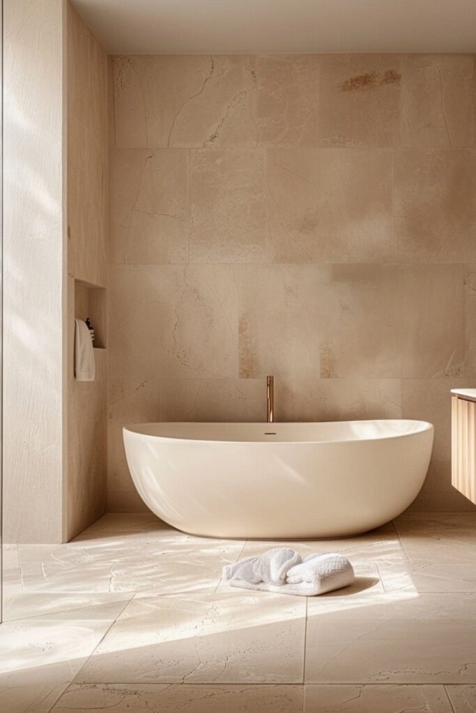 Stone floors and walls can feel cold if not balanced. A freestanding tub with a soft finish helps bring warmth. The contrast between hard stone and smooth tub creates comfort. This idea works well in bathrooms that aim for a natural feel without looking rough or unfinished.