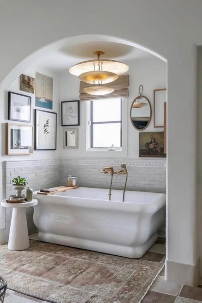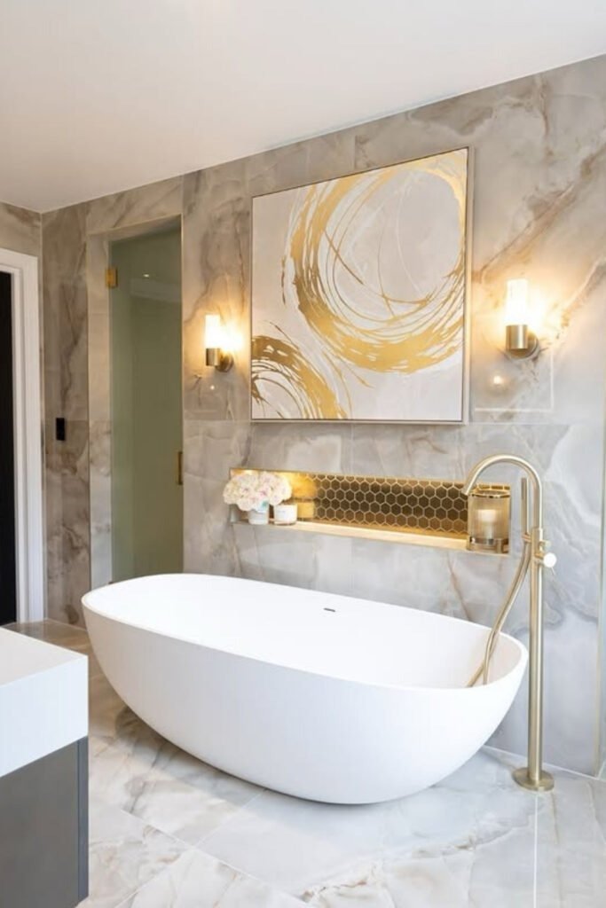 Art and baths can work together when planned well. A single artwork placed near a freestanding tub adds personality without clutter. The tub remains the main feature, while the art adds depth and interest. This approach suits homeowners who want a personal touch without overdesigning.
