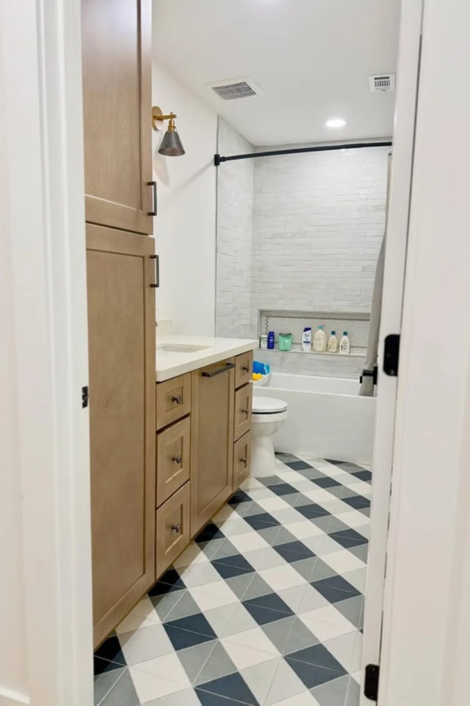Patterned floors are a smart way to add interest without overwhelming the walls. In 2026, kids bathrooms often keep walls simple and let the floor do the work. Subtle patterns help hide dirt and add movement. This approach also keeps the room flexible as kids grow older.