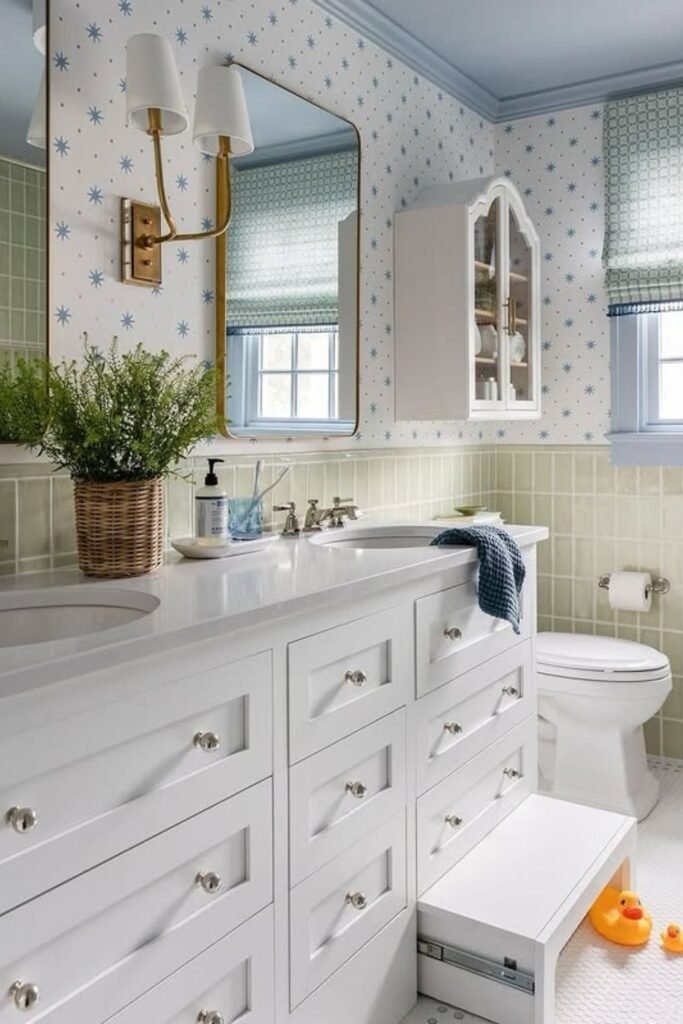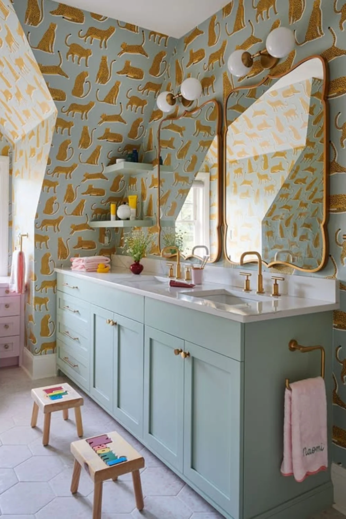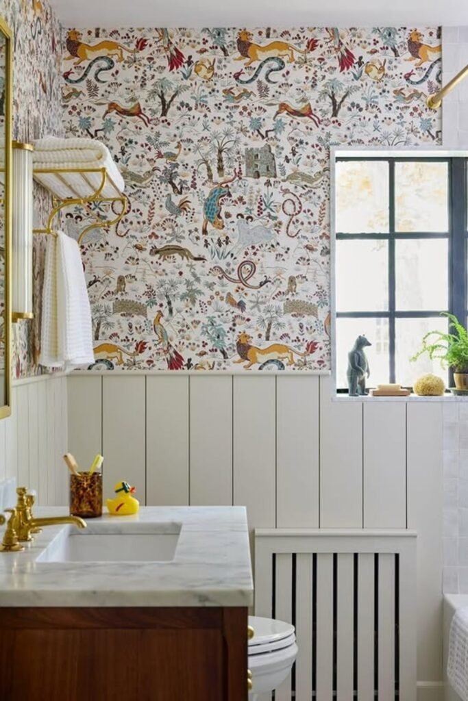 Storybook-style wallpaper adds imagination to a kids bathroom. When used on one wall, it becomes a feature without overwhelming the space. This design encourages creativity while keeping the room practical.