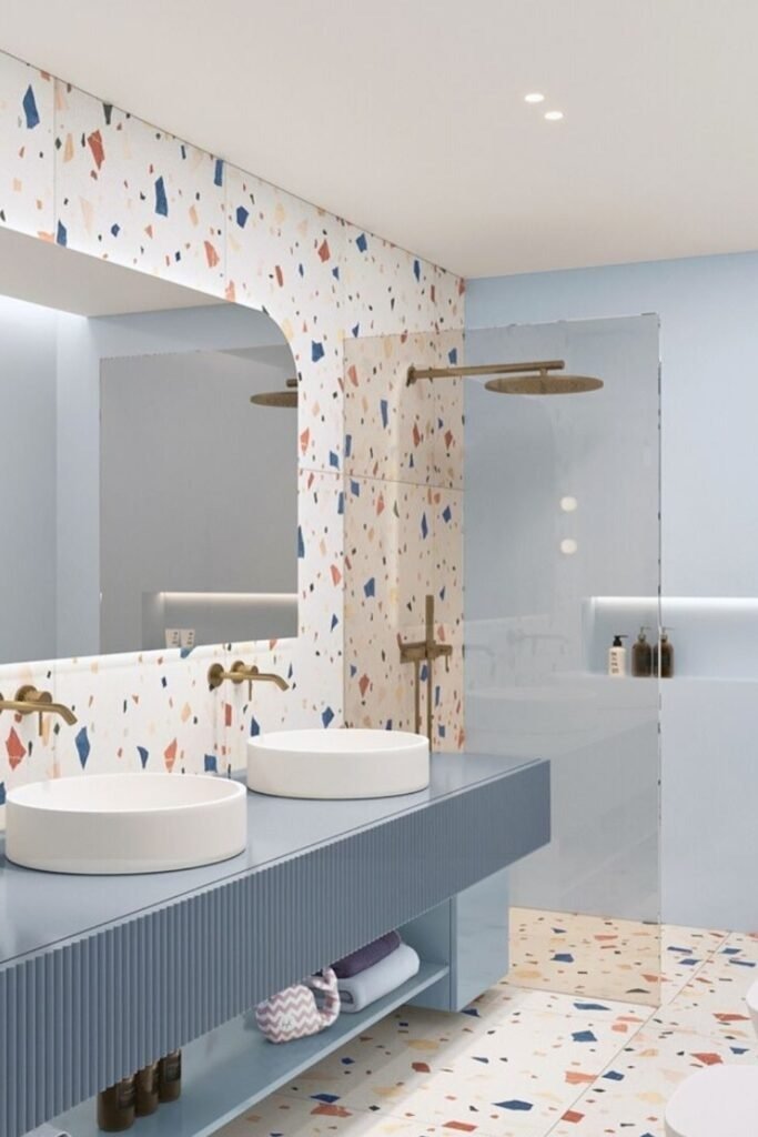 Modern terrazzo with larger chips gives a kids bathroom personality without chaos. Used on walls or floors, it reflects light and keeps the room feeling open. This look fits well with simple fixtures and soft wall colors, helping the space feel playful but controlled.