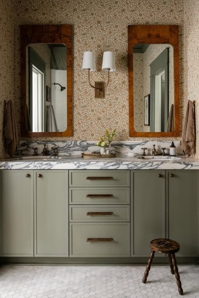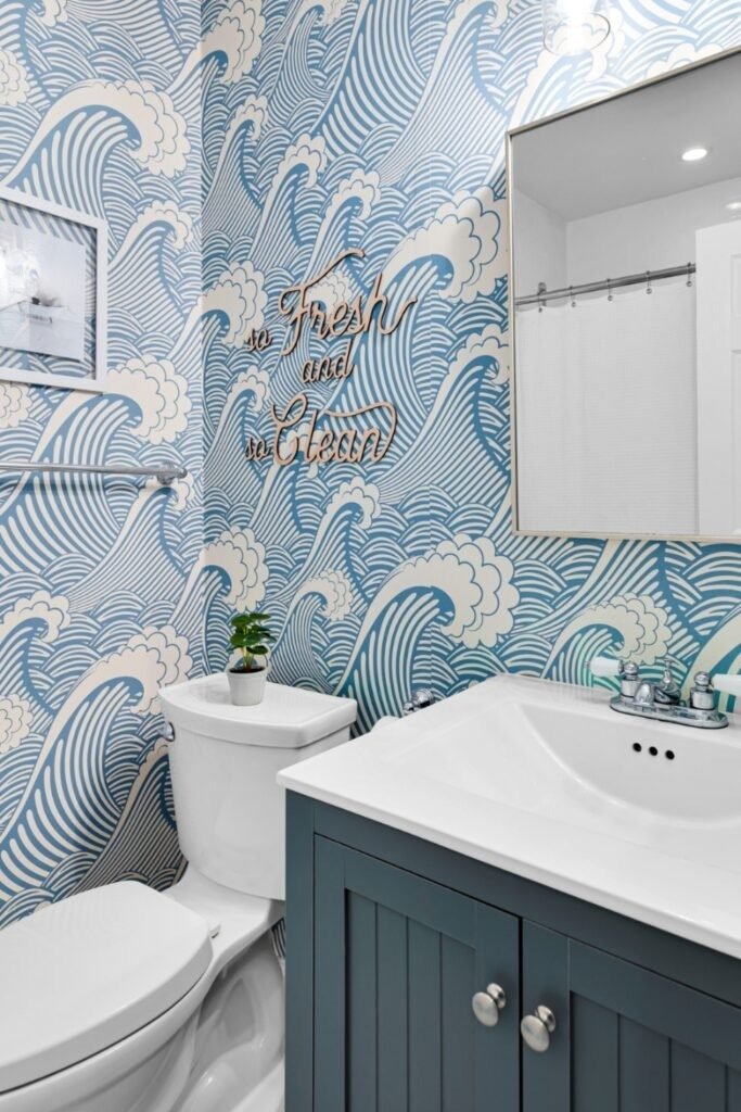 A vanity in a solid, calm color works best with patterned wallpaper. Soft blue, green, gray, or warm wood tones help ground the space. These colors keep the bathroom balanced and prevent the design from feeling busy or chaotic.