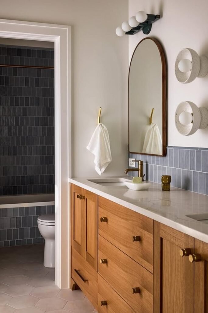 Wood and blue together create a balance between warmth and calm. In kids bathrooms, wood vanities or shelves paired with blue tiles or walls feel inviting. This mix also helps the room blend with the rest of the home, which parents appreciate. It avoids the feeling of a space made only for kids.