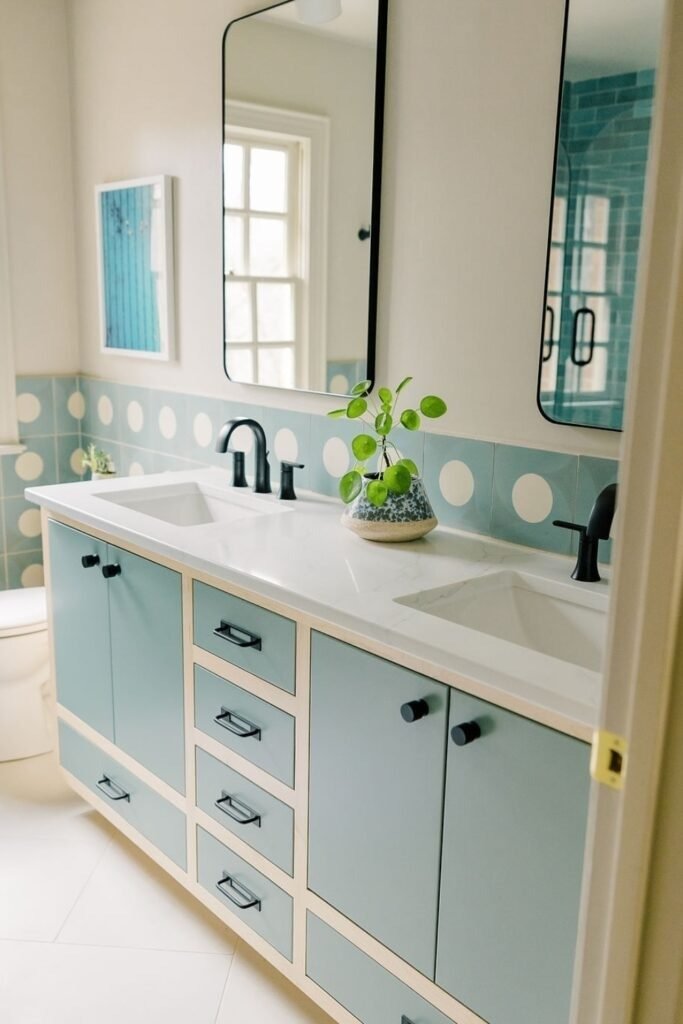 Polka dots bring movement and joy to a kids bathroom. When used in soft tones, they feel light rather than busy. This design works well in smaller spaces where too many details would feel heavy.