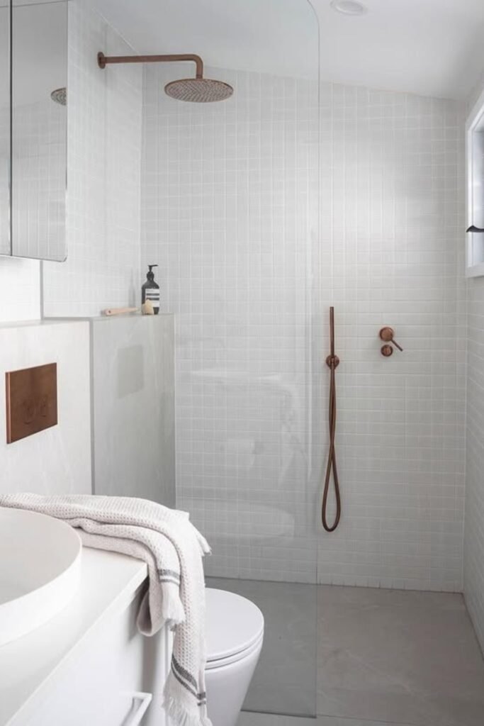 A walk-in shower placed along one side of the room helps maintain a straight, easy path. Slimline fixtures keep visual noise low, which is key in narrow spaces. By keeping controls flush and shelves recessed, the walls stay clean and smooth. This layout is practical for daily use and easy to clean, which is why it remains popular going into 2026.