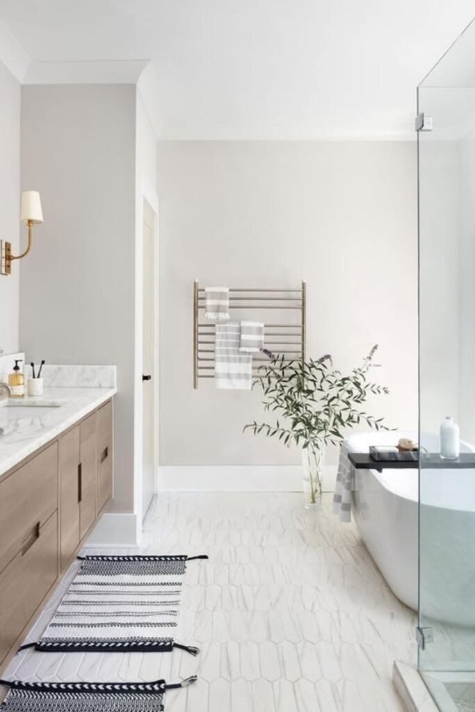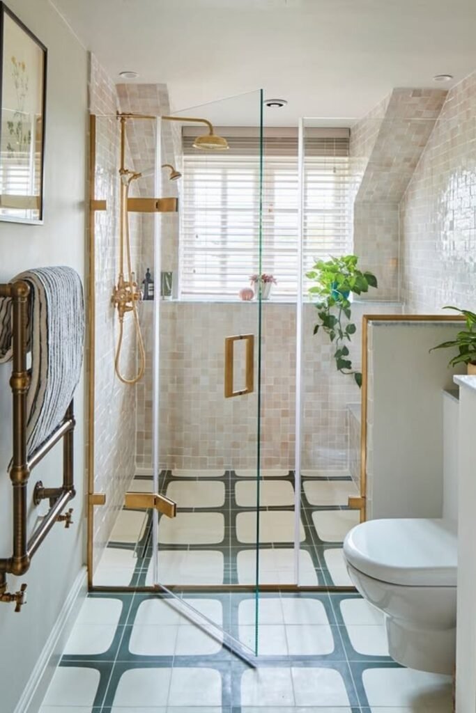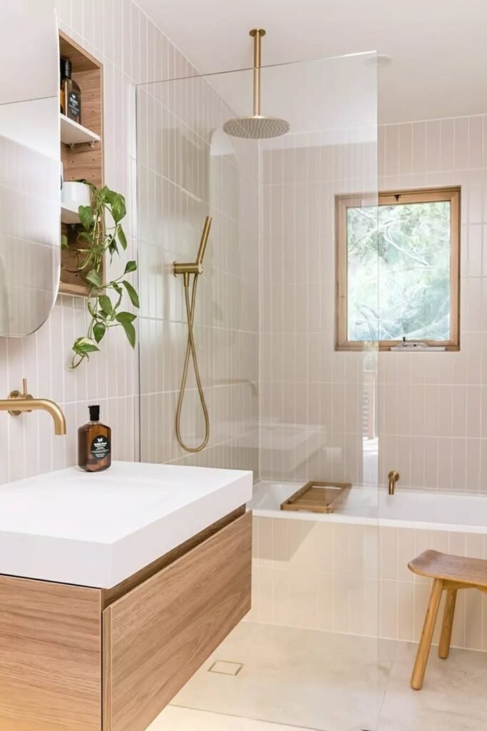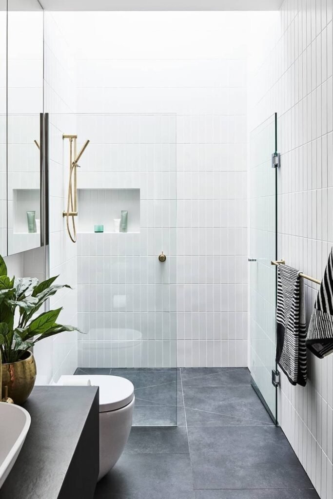 Vertical tile lines draw the eye upward, making the room feel taller. Brass touches add warmth without clutter. This layout is subtle but effective, especially in bathrooms with low ceilings.
