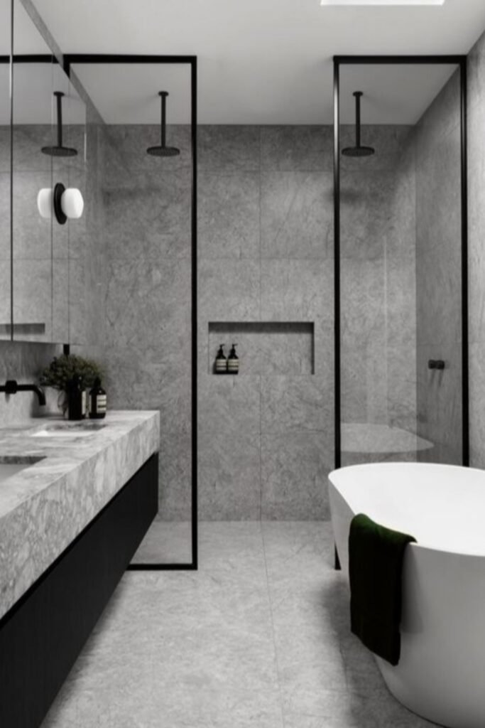 A framed shower enclosure adds structure to a long narrow room. When paired with a centered tub, it creates balance from side to side. The frame acts as a visual break, helping the length feel more controlled. This layout works best when ceiling height is generous, allowing the structure to feel strong without being heavy.