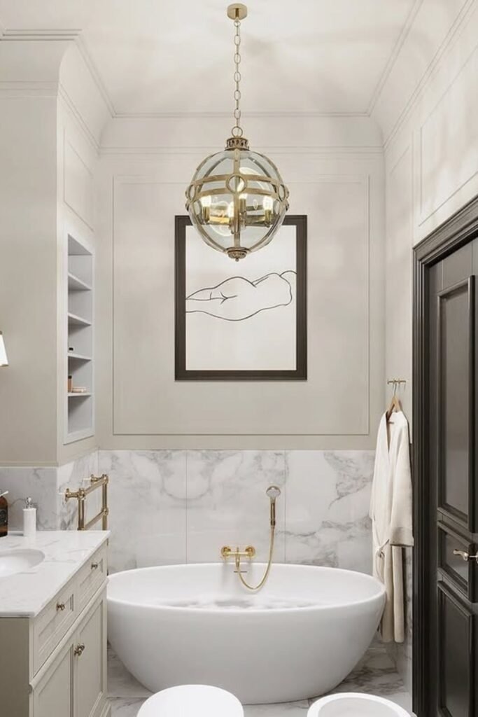 Drawing attention to the end of the room with a tub and a warm ceiling accent changes how the space is read. The ceiling detail pulls the eye upward and forward, reducing the tunnel effect common in narrow rooms. This is a smart trick when wall space is limited.