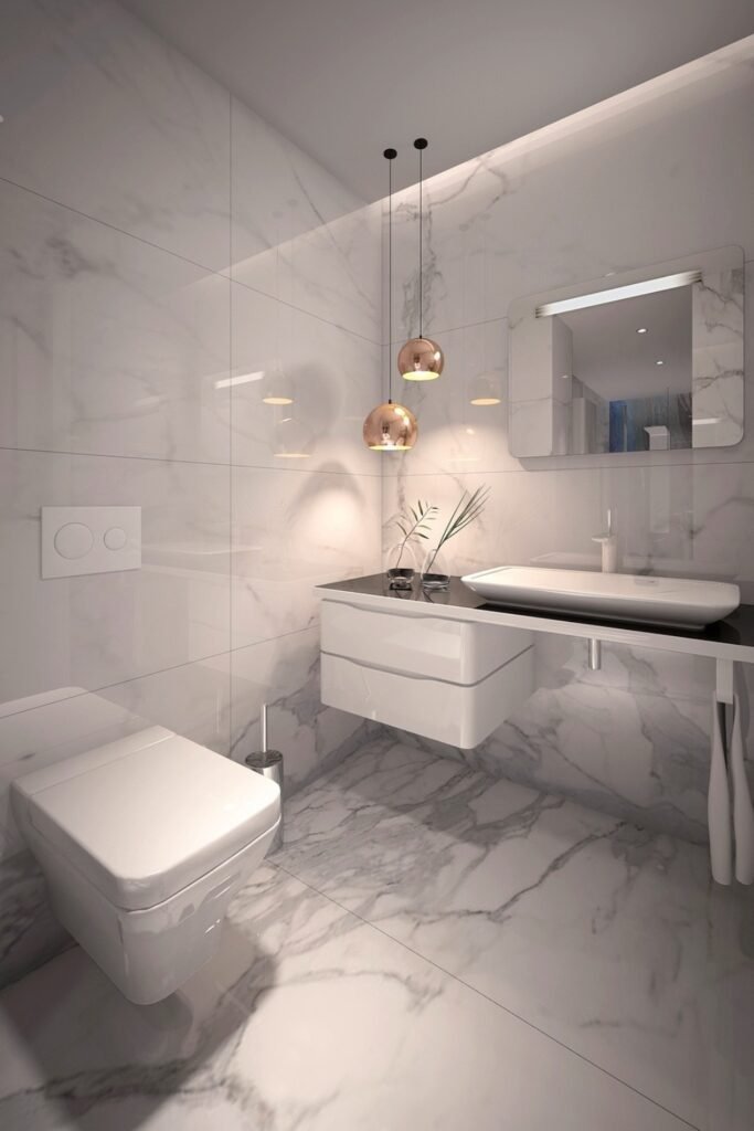 Wrapping the walls in marble or marble-look tile creates continuity that helps long spaces feel smoother. Floating fixtures keep the floor line clear, reducing visual breaks. This layout feels refined but still practical when storage is built into walls rather than added on.