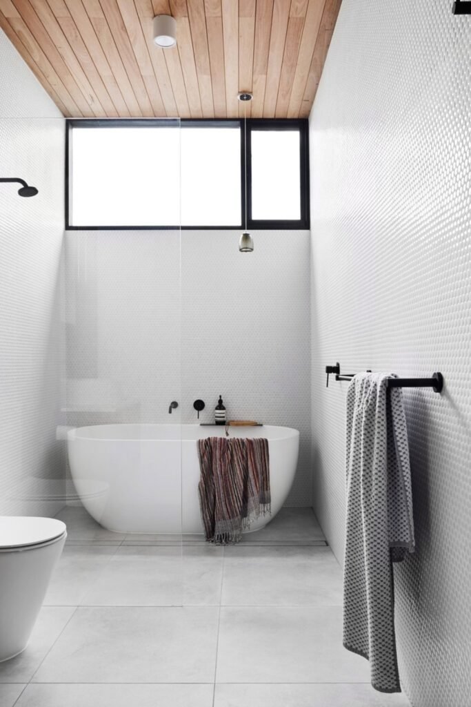 In this design, the vanity floats near the entrance while the tub anchors the far end. This creates a natural flow from dry to wet areas. The floating vanity opens up floor space and allows light to move freely. Placing the tub at the end gives the room a clear finish point, which helps the space feel intentional rather than stretched.