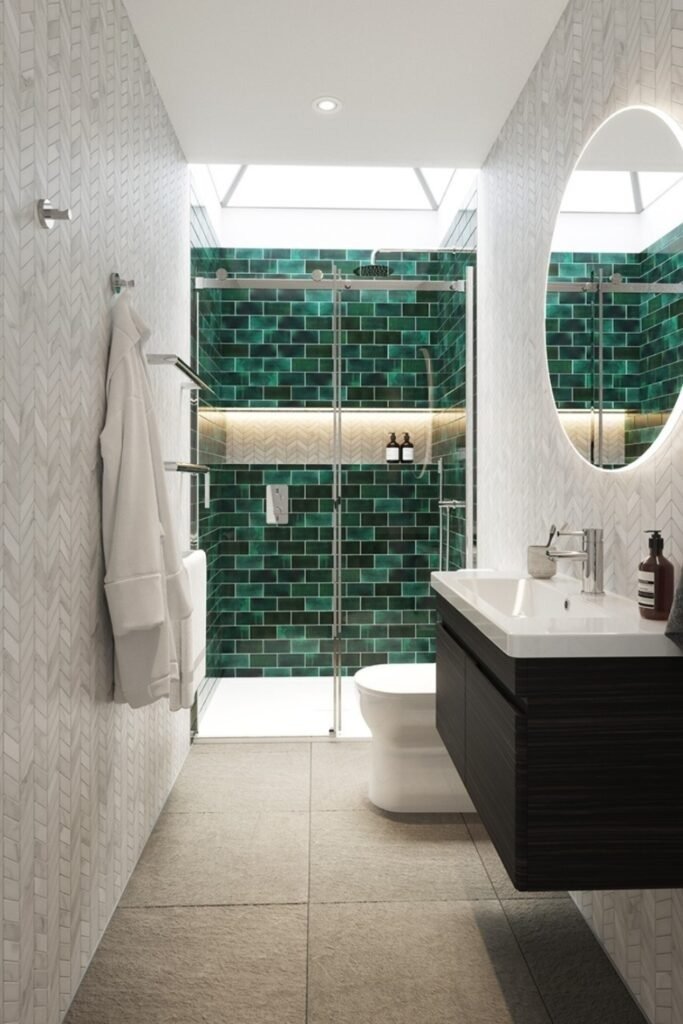 An accent shower wall in emerald tile adds depth without clutter. When placed along one side, it gives the room character while keeping the layout simple. The key is limiting the color to one area so the bathroom does not feel busy.
