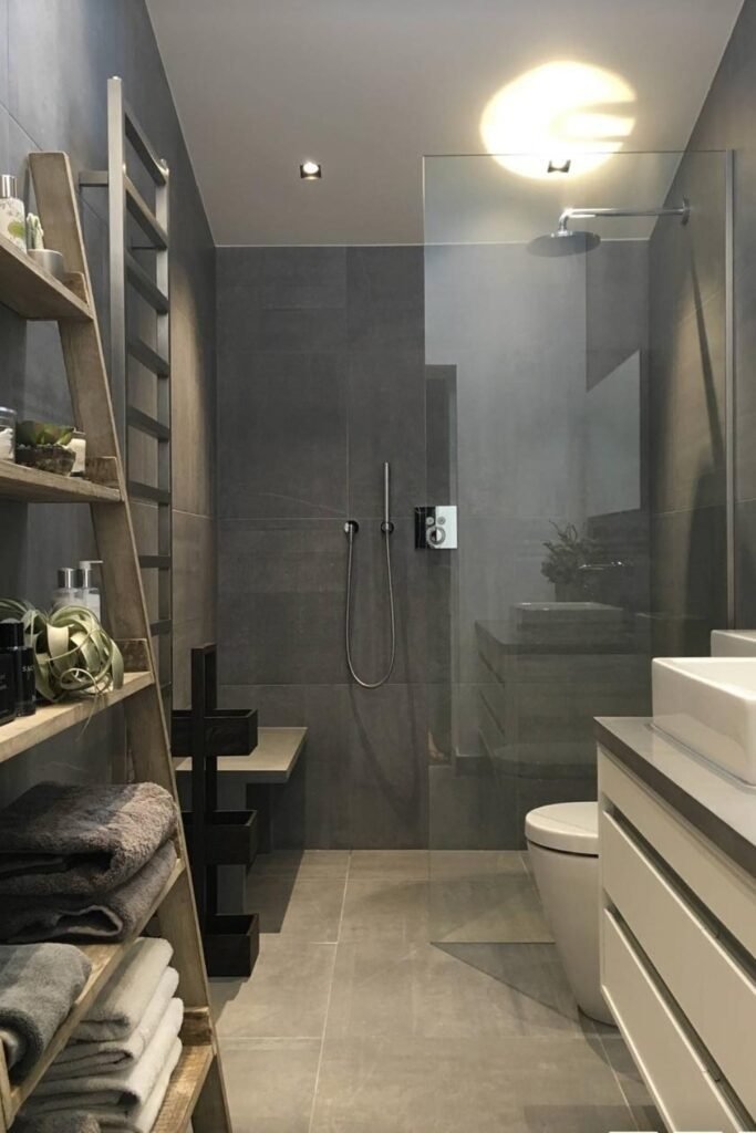 Dark tile can work in narrow bathrooms when paired with open storage that keeps the room from feeling boxed in. A walk-in shower with dark finishes creates contrast, while open shelves maintain a sense of openness. Lighting plays a major role here, ensuring shadows do not shrink the space.