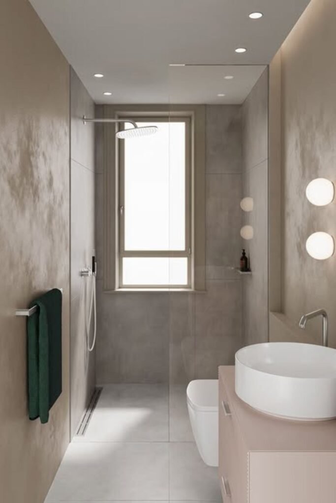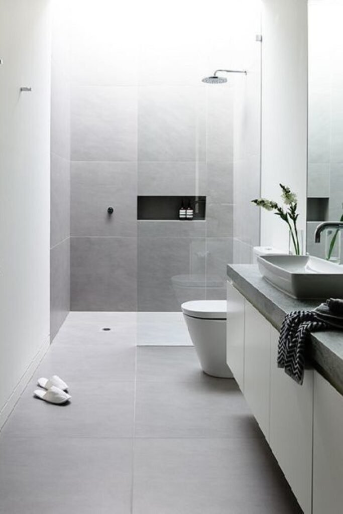 Grey tones create a neutral backdrop that does not distract from the room’s shape. Hidden storage niches keep essentials accessible without adding bulk. This layout is all about calm and order, making it ideal for shared bathrooms.