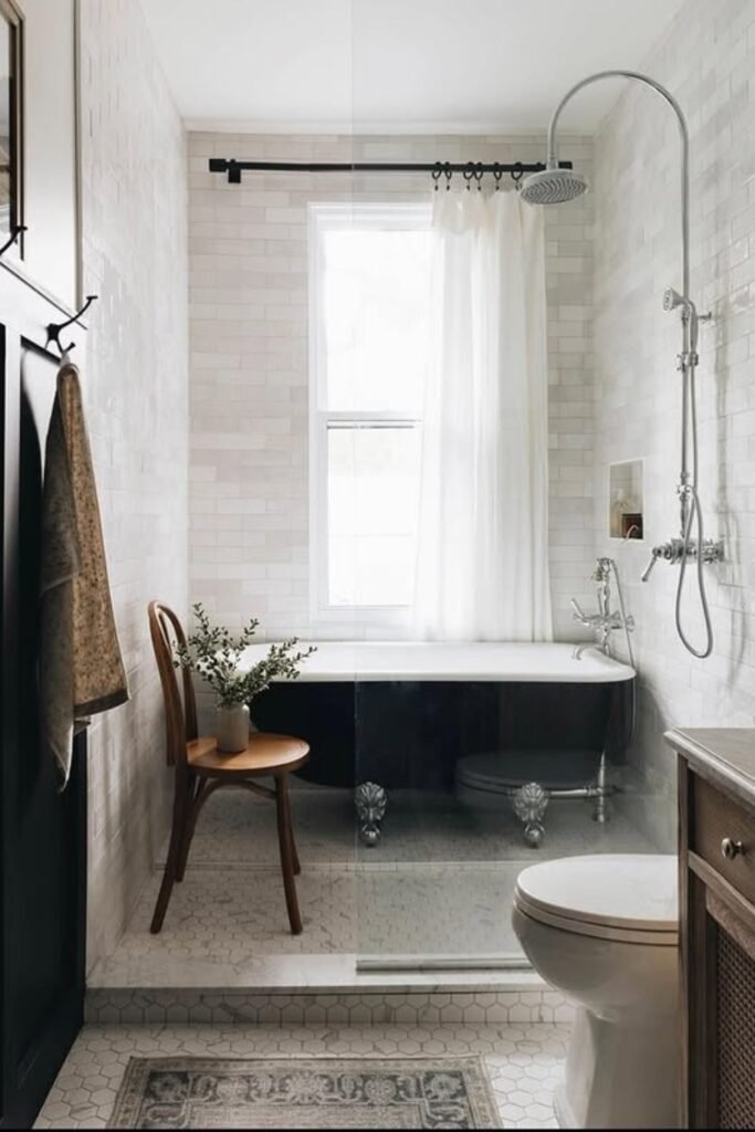 A clawfoot tub placed lengthwise can work surprisingly well in narrow spaces. Using a ceiling-mounted curtain frame allows the tub to function as both bath and shower. This layout suits older homes where charm matters as much as efficiency.