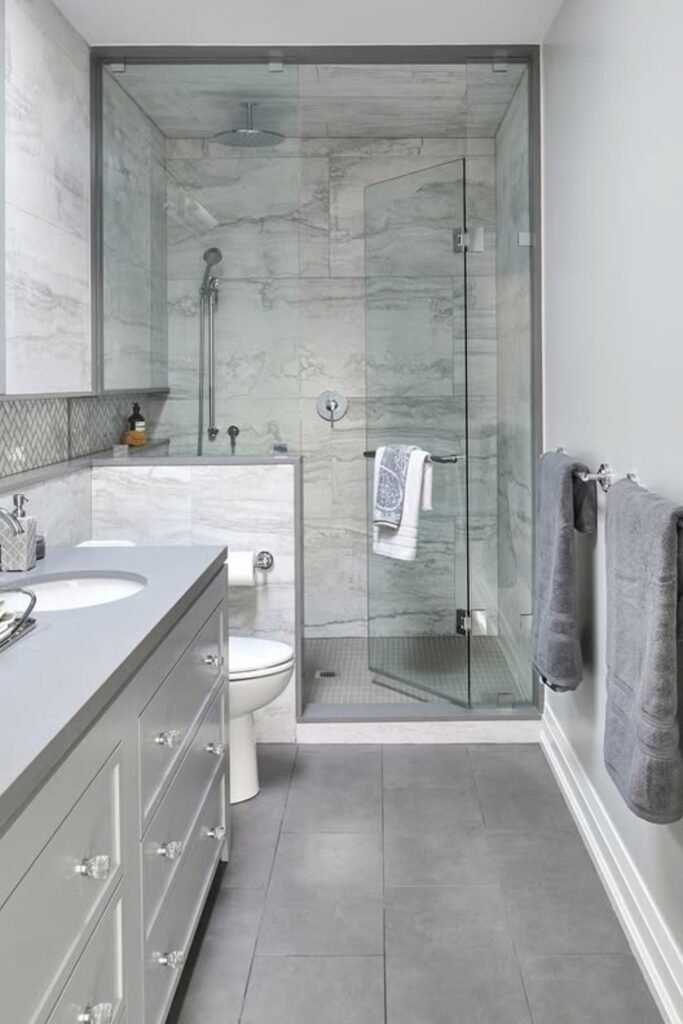 Light grey finishes reflect light without feeling stark. A glass-enclosed shower keeps the room visually open. This layout is practical and adaptable, fitting both modern and transitional homes.