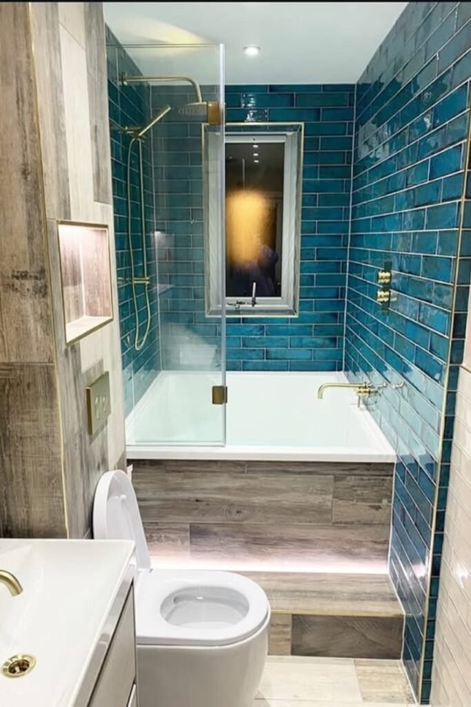 A raised tub platform adds height variation, which helps break up the long shape. Teal tile brings interest without overwhelming the room. This layout works best when the platform is kept low and simple.