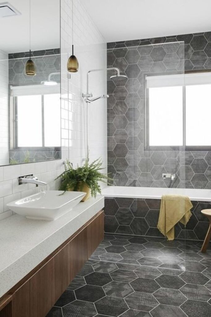Dark hex tiles add texture and grip, making them ideal for floors in narrow bathrooms. Bright walls or fixtures create contrast, preventing the room from feeling closed in. This layout balances safety and style.