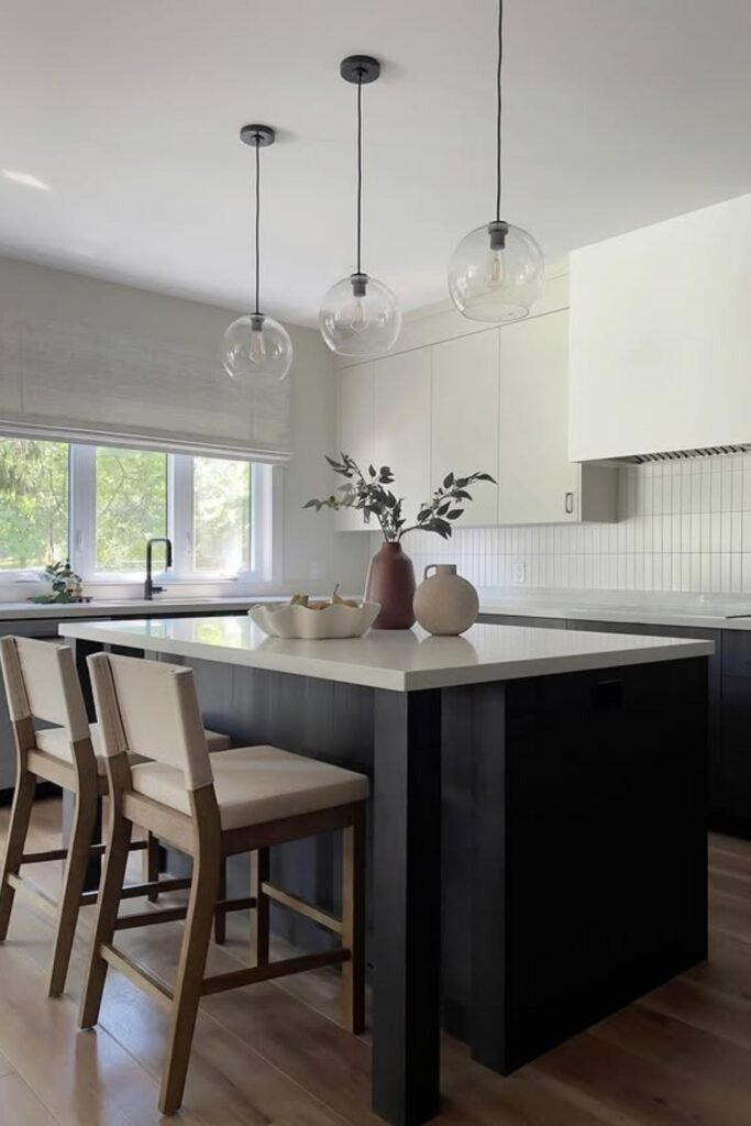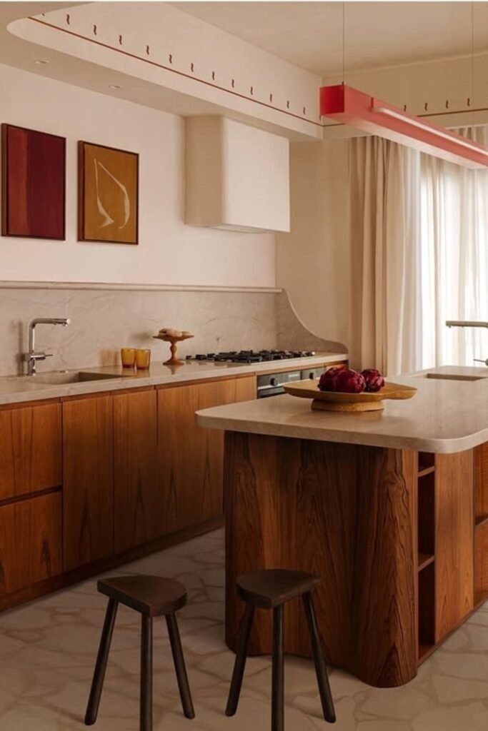 Bar stools, lighting, and handles carry rounded shapes. These small decisions change how the room feels more than color alone.