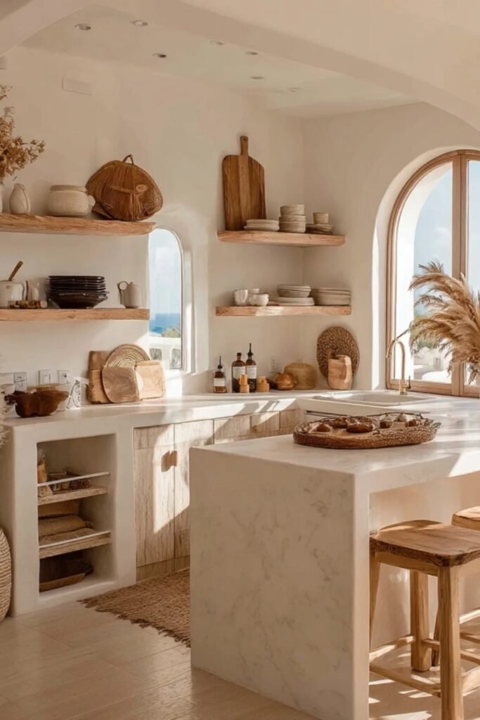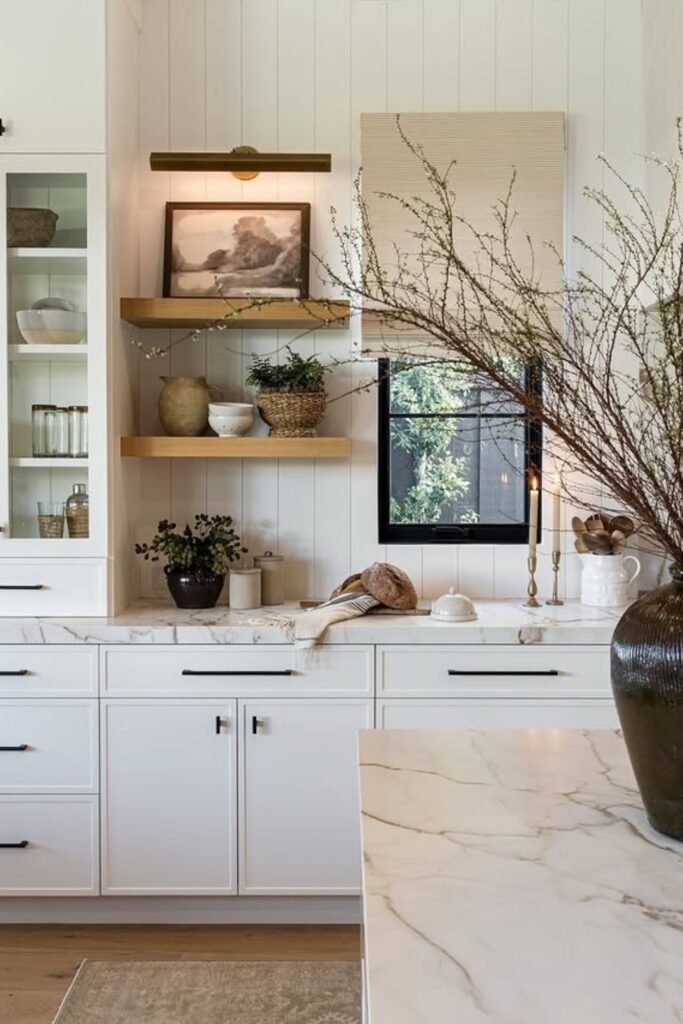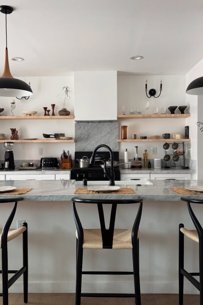 Open shelving holds daily items instead of hiding everything. Ceramic bowls, glass jars, and cutting boards become part of the design. The kitchen gains personality without clutter.