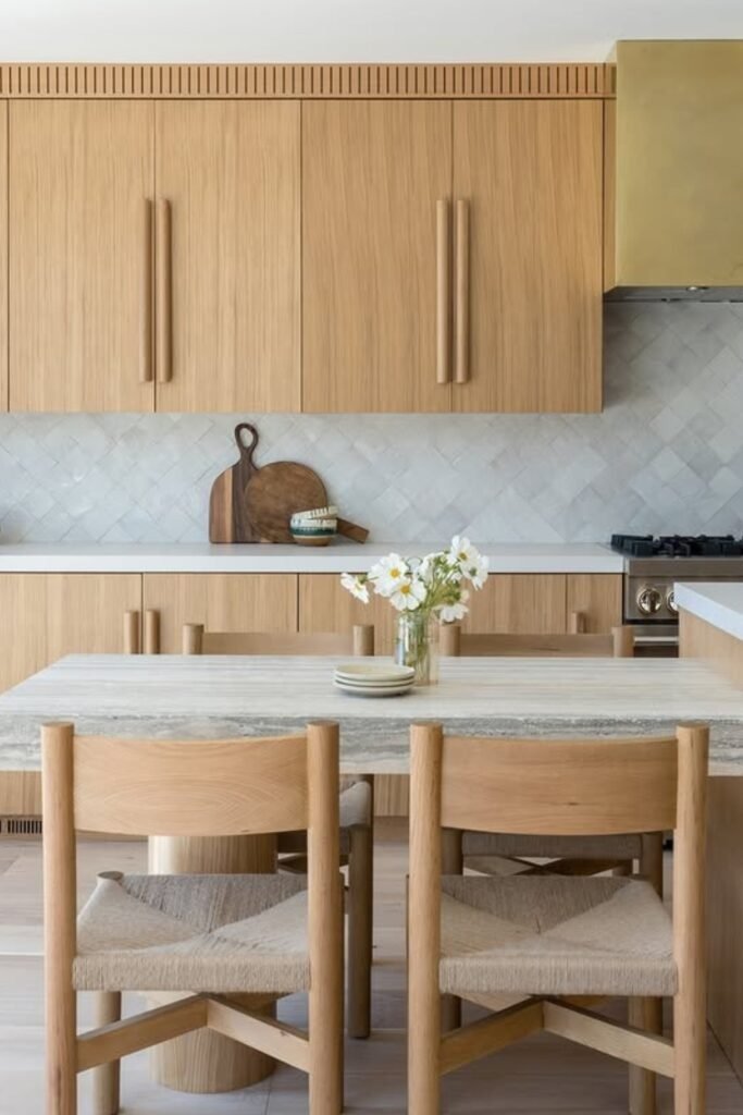 An organic modern kitchen is a space where structure meets nature. Cabinets stay simple and flat, but materials feel warm and grounded. Instead of shiny finishes, surfaces look soft and real.