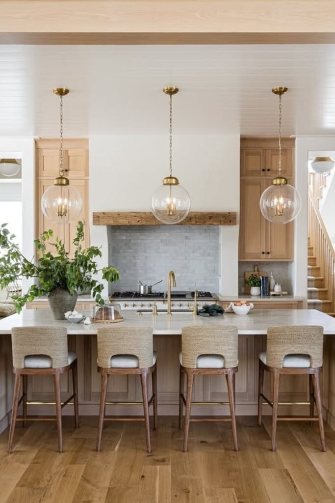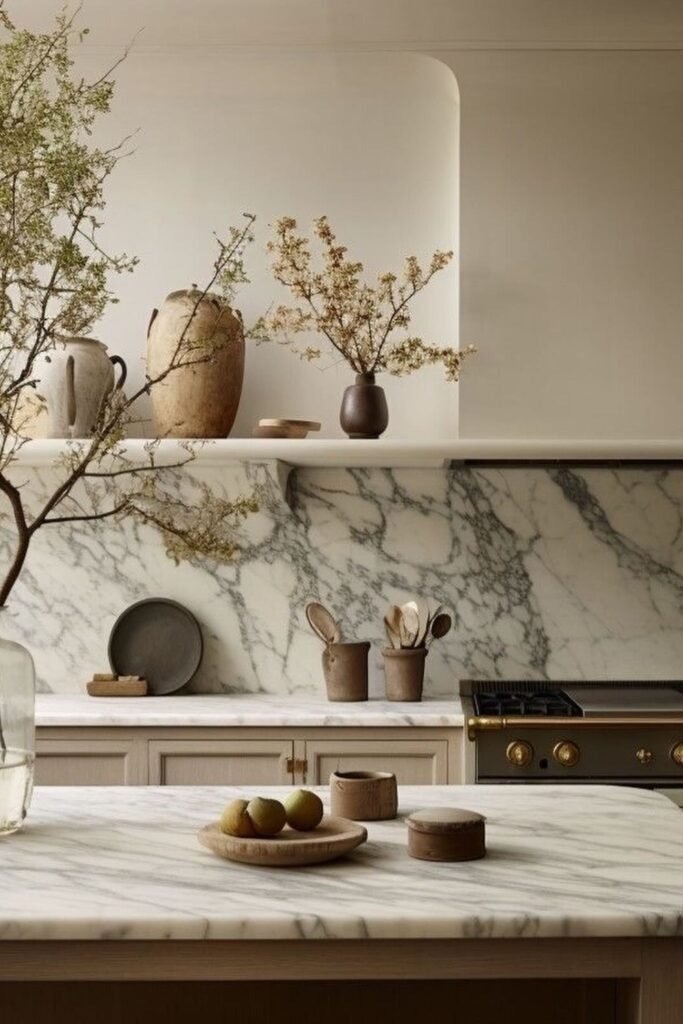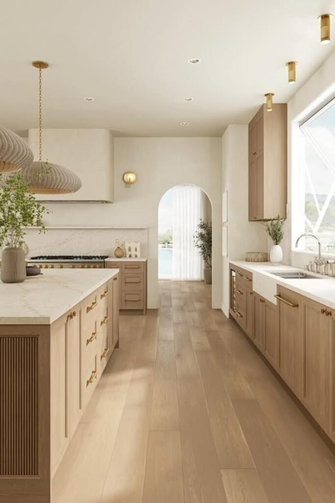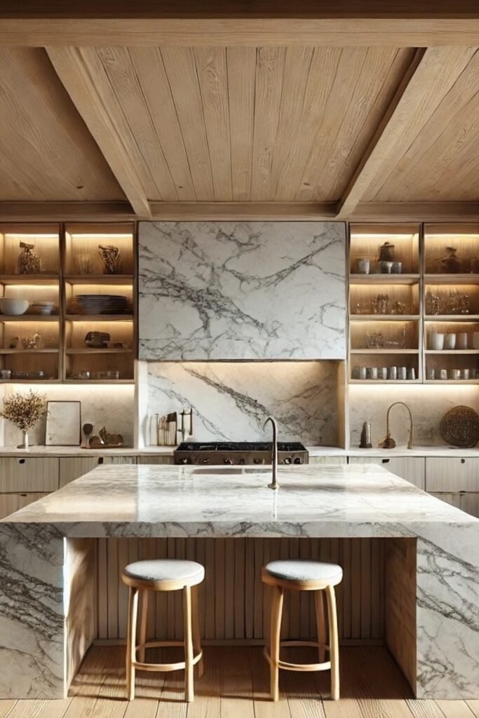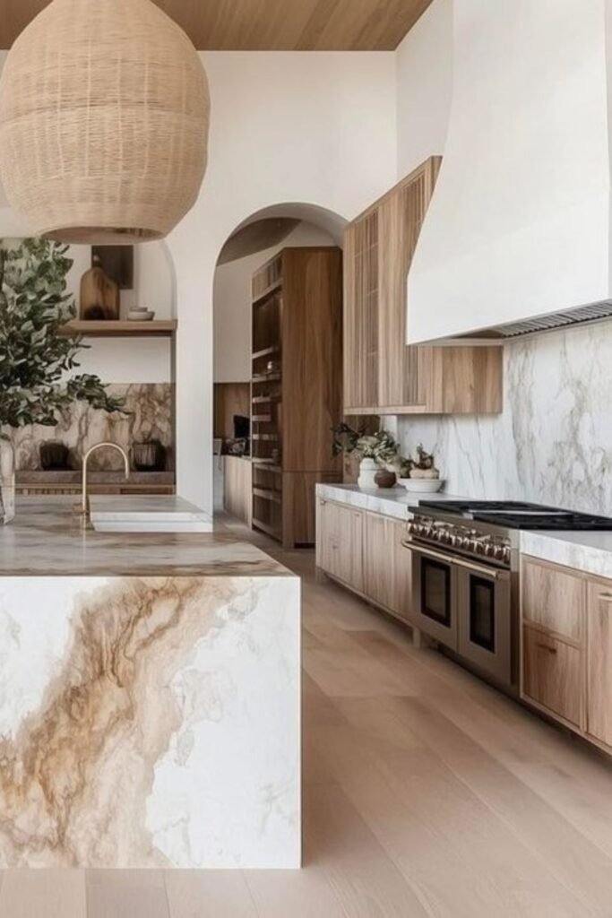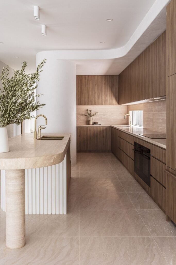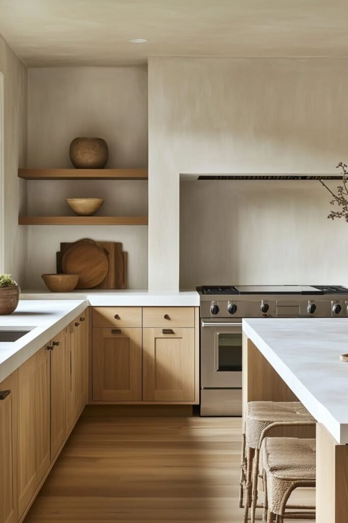 The balance comes from combining simple shapes with natural materials. Flat cabinets keep the modern look. Wood, stone, and warm lighting bring the organic feeling. Remove extra decoration and allow material texture to become the visual interest.