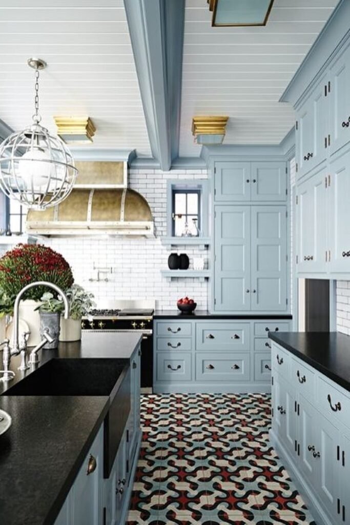 Sky blue cabinets bring lightness to kitchens that lack strong daylight. This shade is lighter than powder blue and feels airy. It works well in coastal and casual homes, but also in simple modern spaces. Sky blue reflects light and helps kitchens feel open.