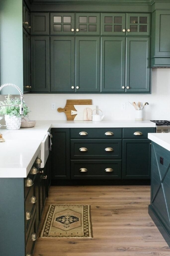 After years of use, forest green holds its look well. It does not show small chips as easily as black and feels warmer than navy. This color pairs well with wood shelves, stone backsplashes, and simple hardware. It works in both modern and classic kitchens, making it a strong long-term choice.