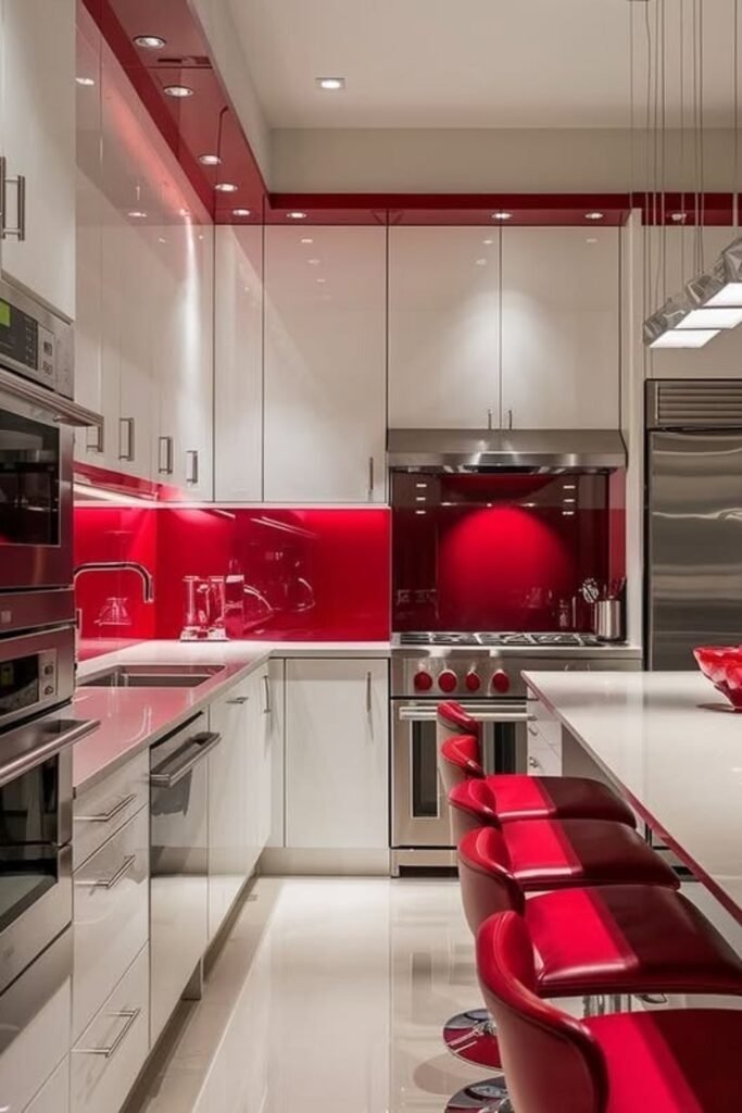 Crimson pop is used with care in 2026. It is not meant for full kitchens. Instead, homeowners use it on islands or accent cabinets. This deep red adds warmth and energy without taking over the room. It works best when surrounded by neutral colors.