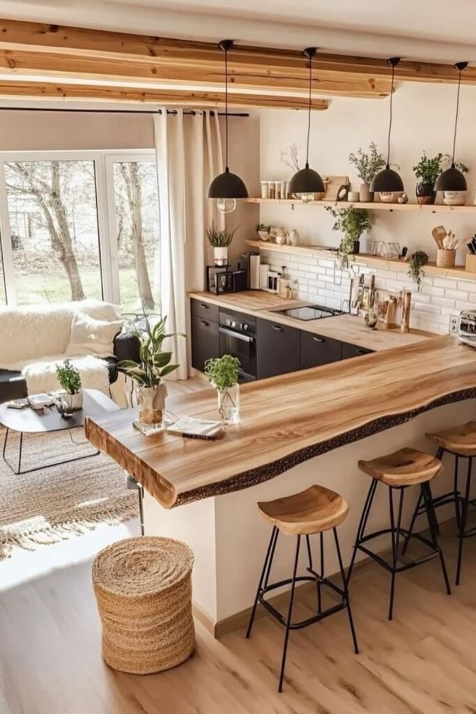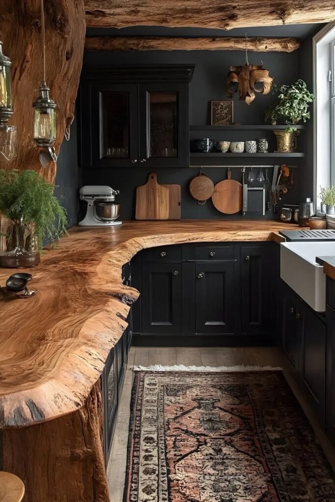 A live-edge warmth kitchen uses natural wood edges on counters, shelves, or islands. These pieces bring raw nature into the room. Each edge is different, which adds character without effort.