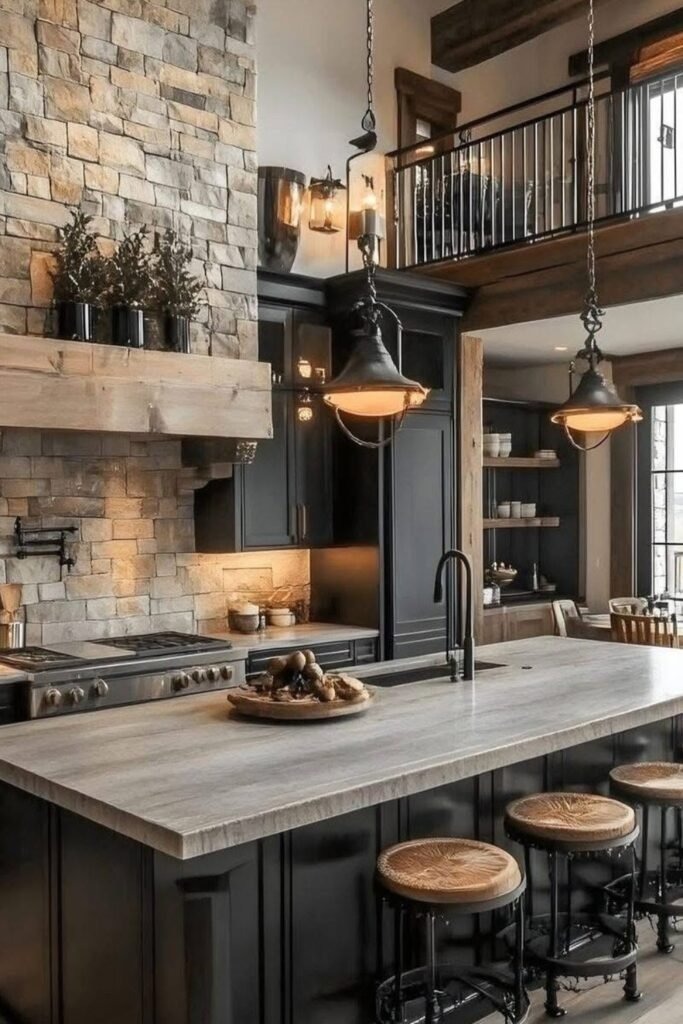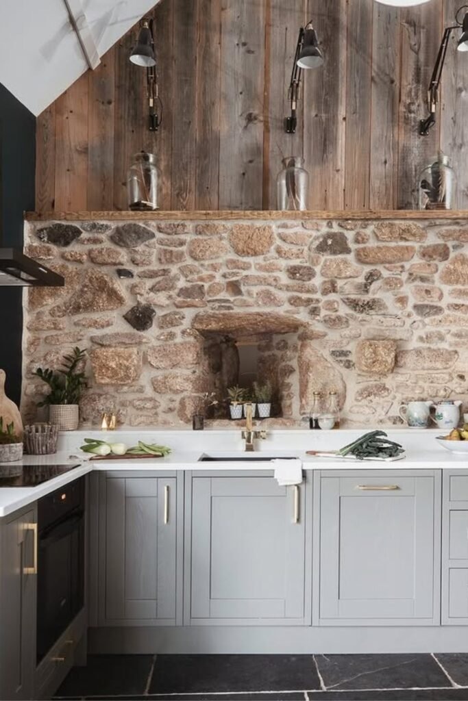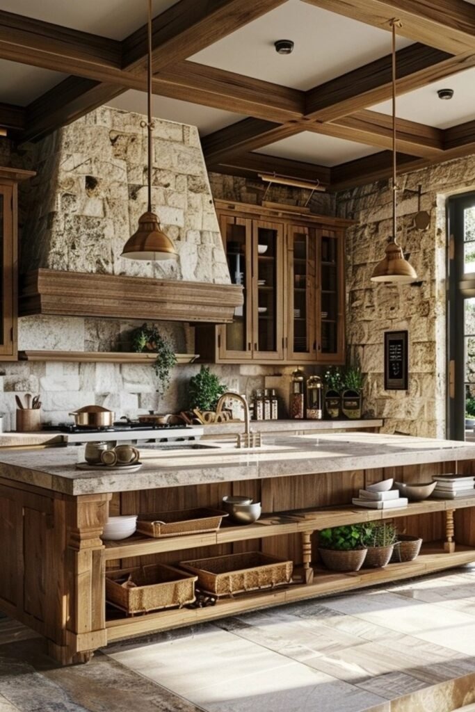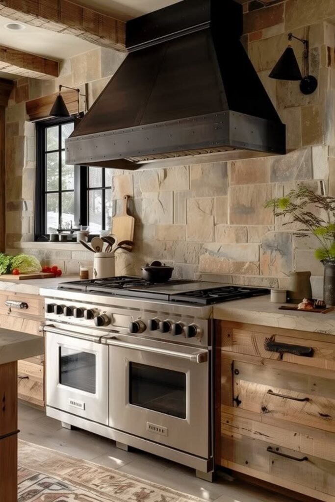 Stone and iron kitchens feel solid and lasting. Stone backsplashes or walls add texture, while iron hardware adds strength. This combination works well in homes that want a deeper rustic feel.