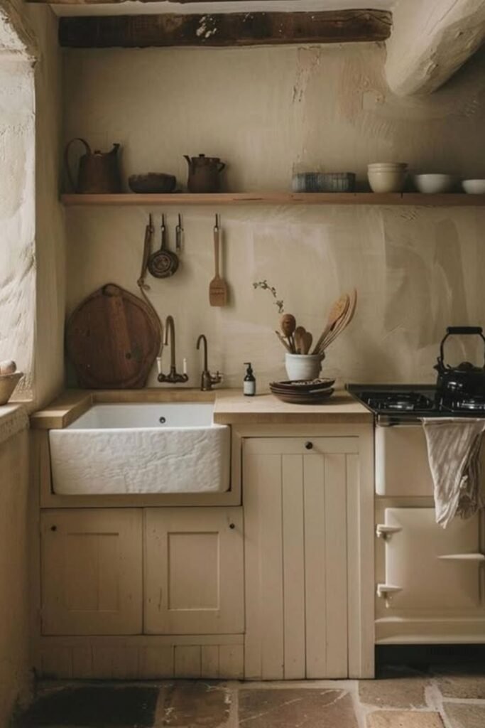 Minimal rustic kitchens focus on function and feel. Few items are visible, but materials remain natural.