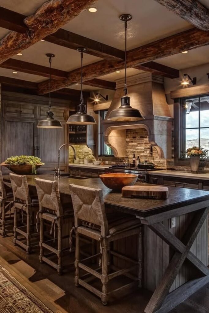 Lodge-style kitchens draw from mountain homes. They use darker woods, stone accents, and strong beams. This style feels protective and warm, especially in colder climates.