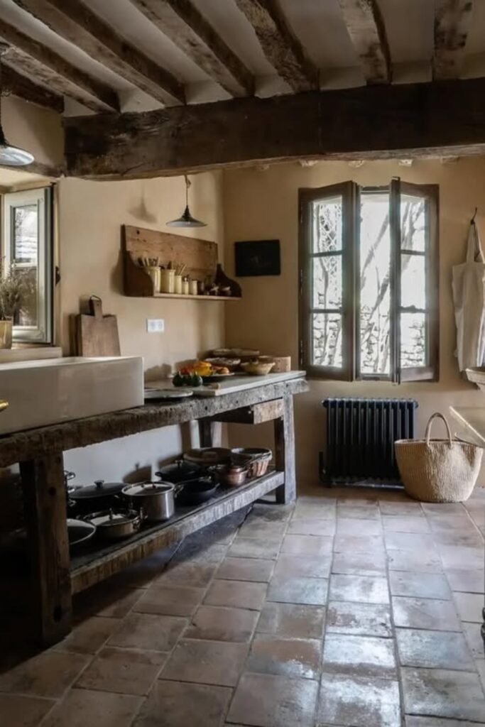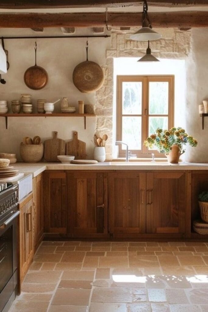 A Mediterranean rustic kitchen uses earth tones, plaster walls, and natural tile. The space feels open and sun-touched. Wood beams and soft curves help soften the room.