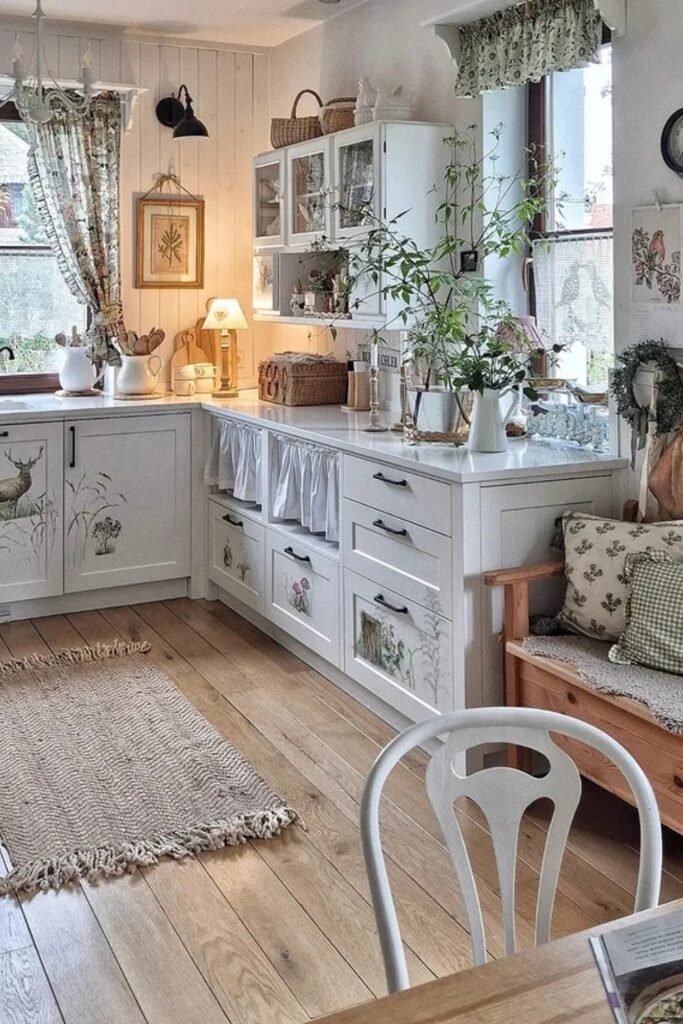 Cottage bloom kitchens feel light and lived in. They often include soft colors, simple cabinets, and small details that feel personal. Wood floors and open shelves add warmth.