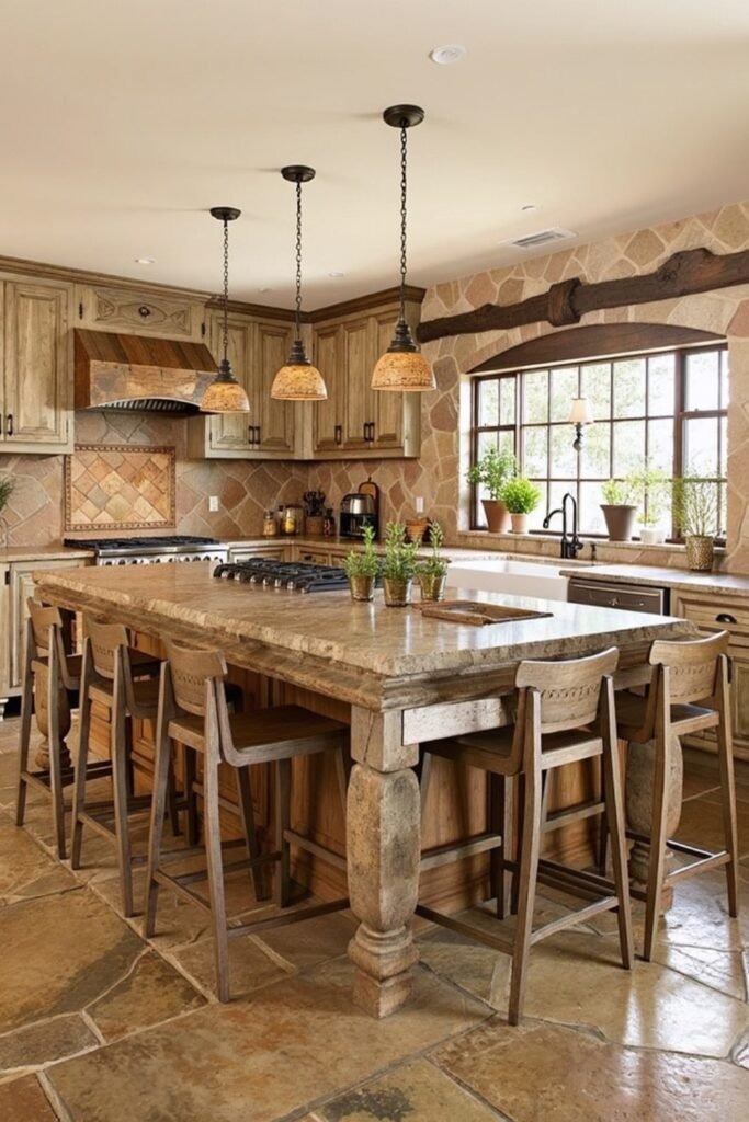 This style needs space to breathe. In smaller kitchens, focus on one stone element rather than many.