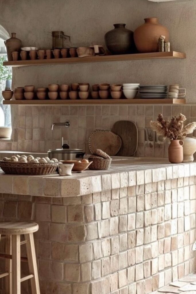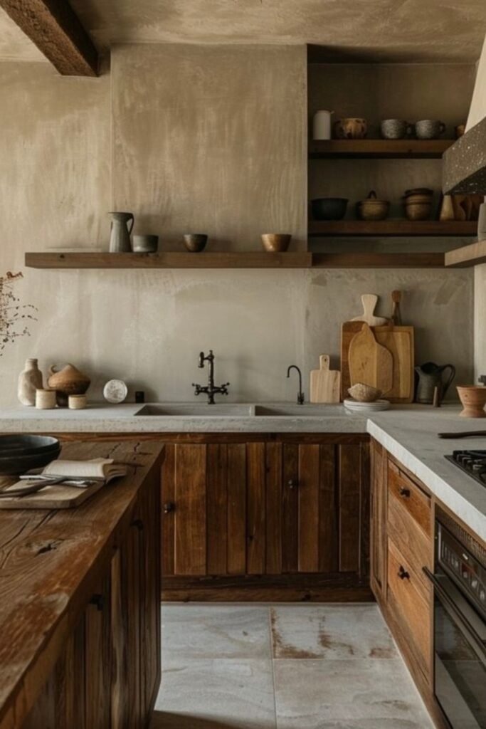 An earthen minimal kitchen blends rustic materials with simple design. Wood, clay, and stone are used in clean ways. There is little decor, but the materials speak for themselves.