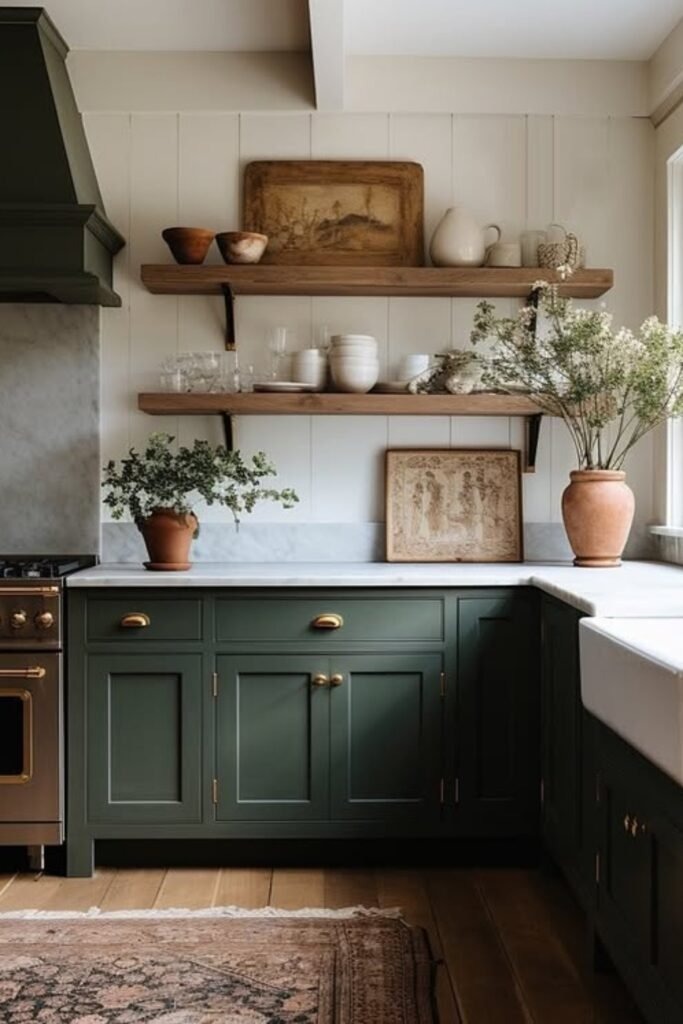 This style works best when green is used on cabinets or walls, not everywhere. Let wood floors and open shelving balance the color. The result is a kitchen that feels welcoming and easy to live in.