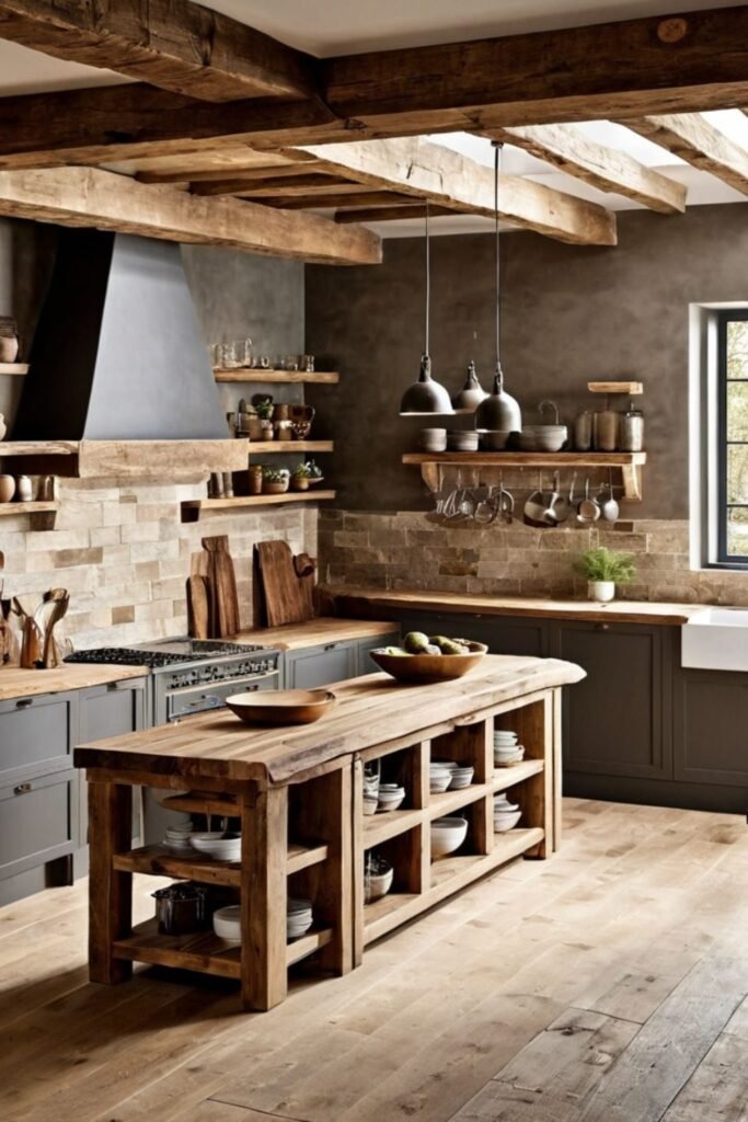 Industrial rustic kitchens mix raw materials with warmth. Exposed metal, concrete, and wood work together when balanced well.