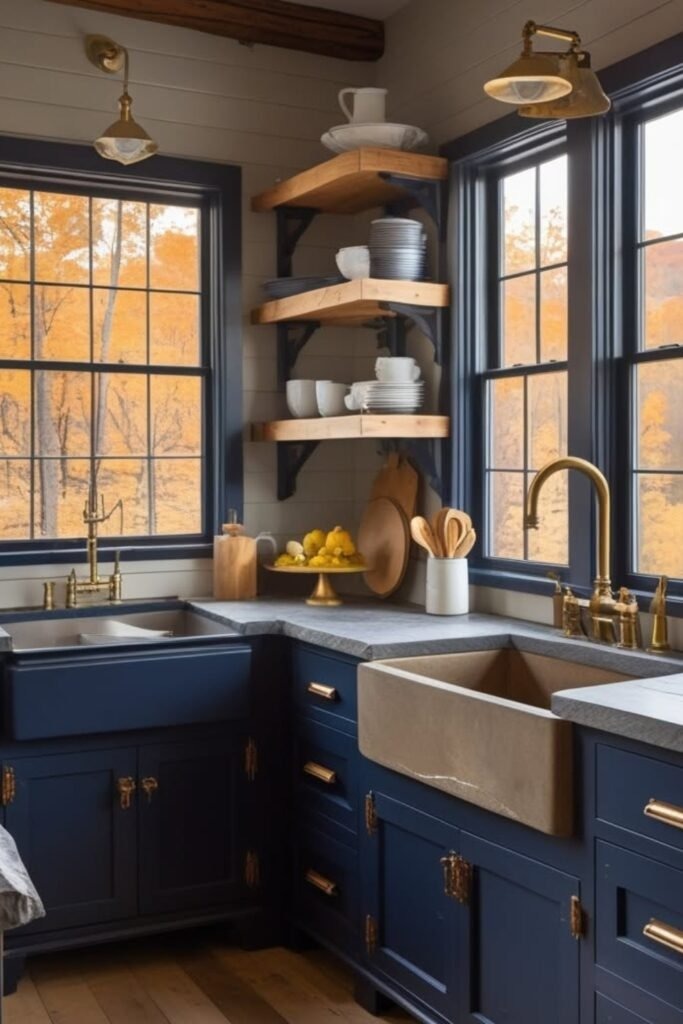 Navy charm kitchens use deep blue with rustic materials. The color adds depth while wood keeps it warm.