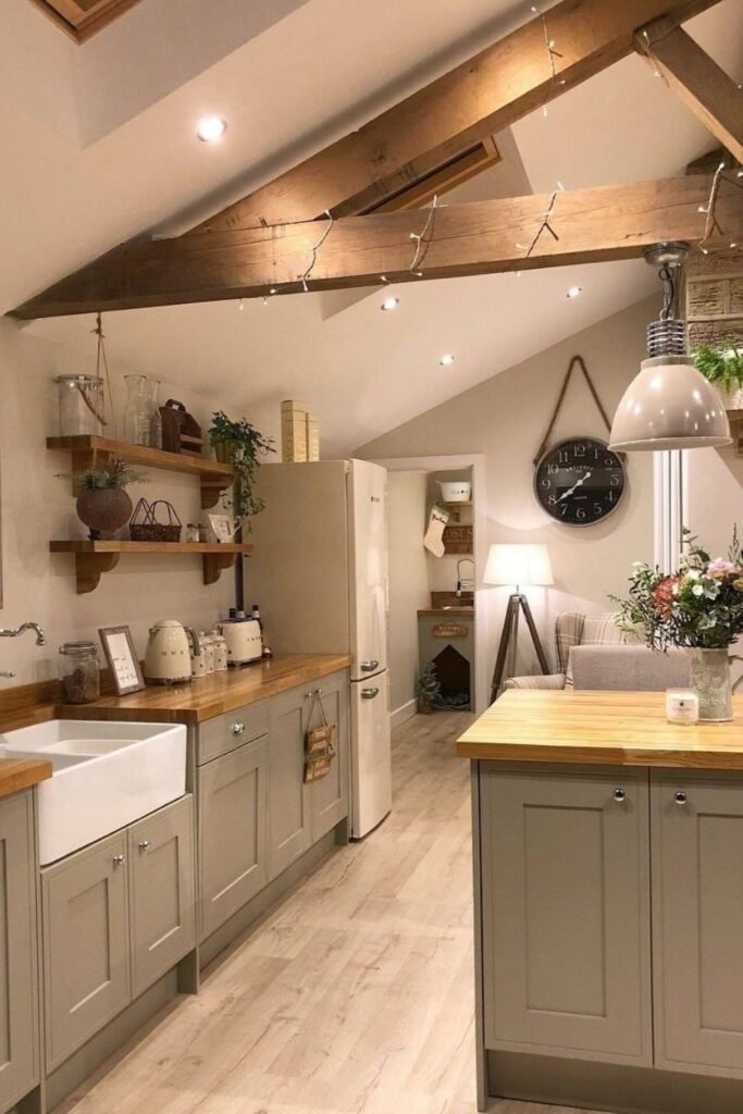 Cozy beam kitchens highlight ceiling beams. These beams add structure and warmth.