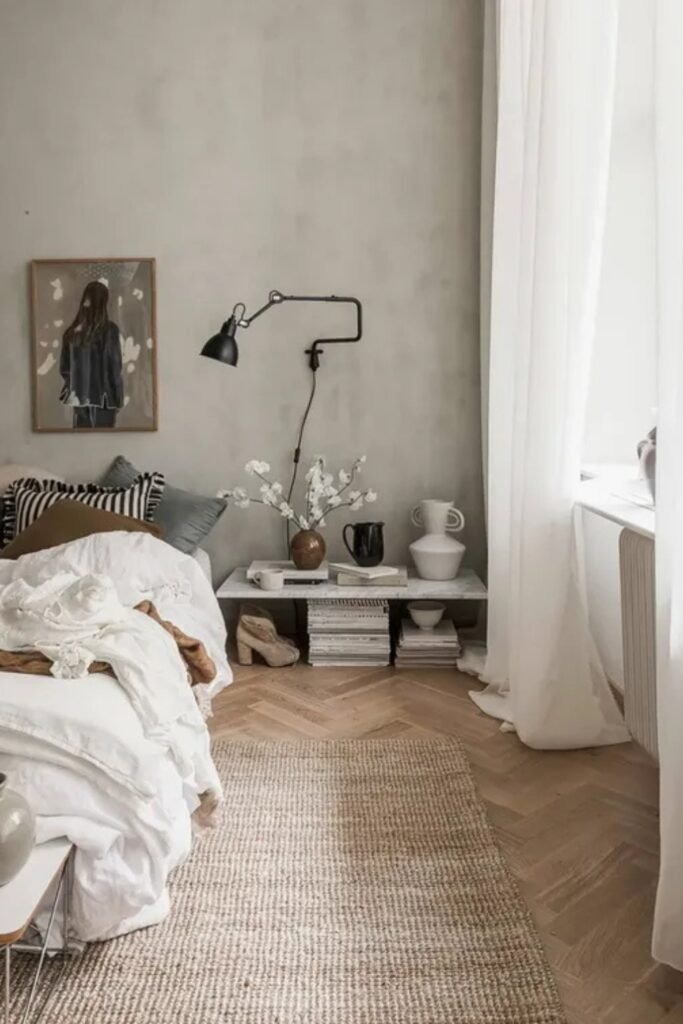 Grey is used in Scandinavian bedrooms, but never in a cold way. Balanced grey warmth comes from using soft grey tones with warm undertones. These greys work well with white walls and light wood floors. They add depth without making the room feel dark. In 2026, people are choosing greys that feel natural, closer to stone or soft fabric, instead of flat modern grey.
