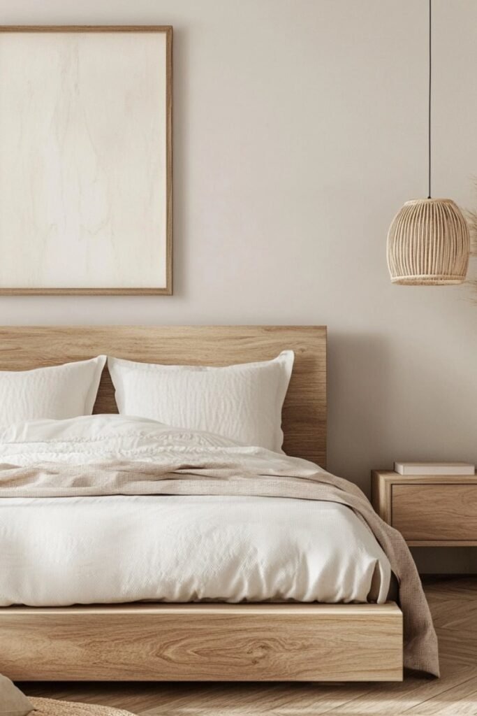 Warm wood balance is about mixing wood tones without overdoing it. A light wood bed with slightly darker wood floors creates contrast while staying soft. The goal is harmony, not matching everything exactly. This approach comes from real homes where furniture is collected over time. It keeps the room feeling natural and relaxed instead of staged.