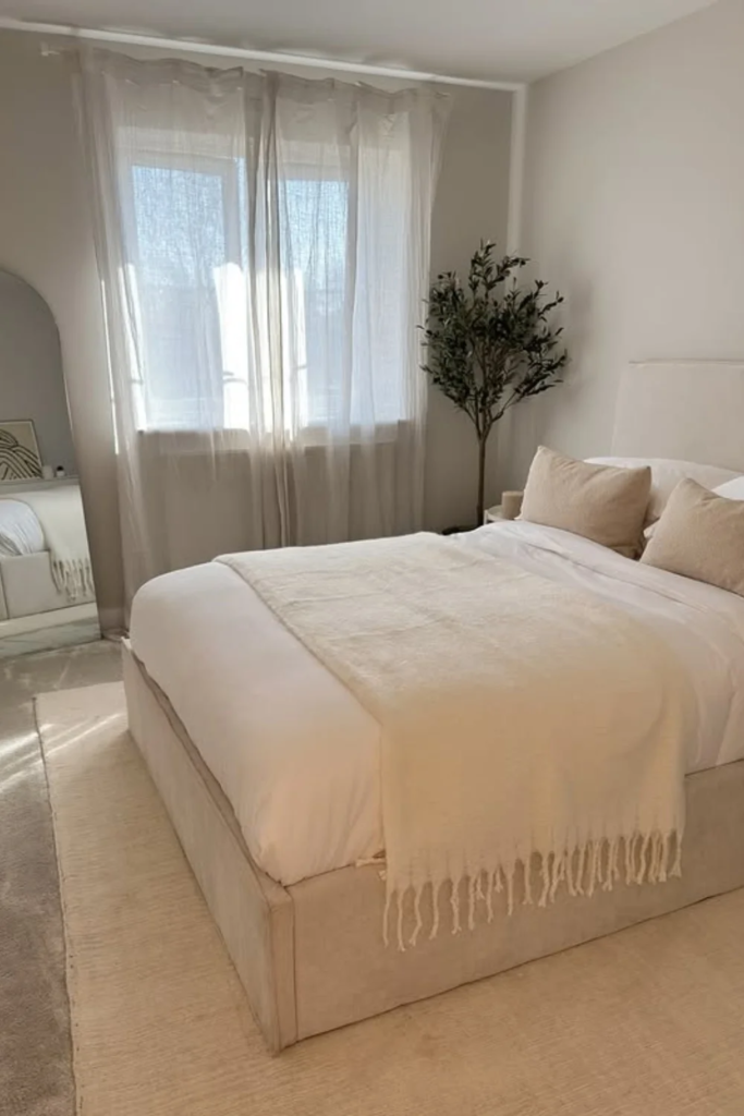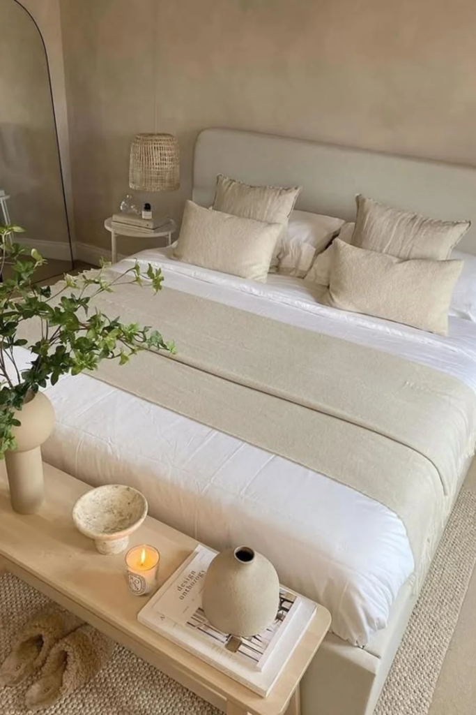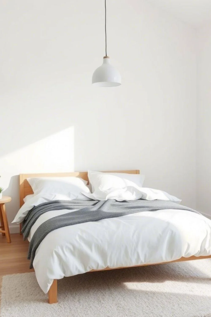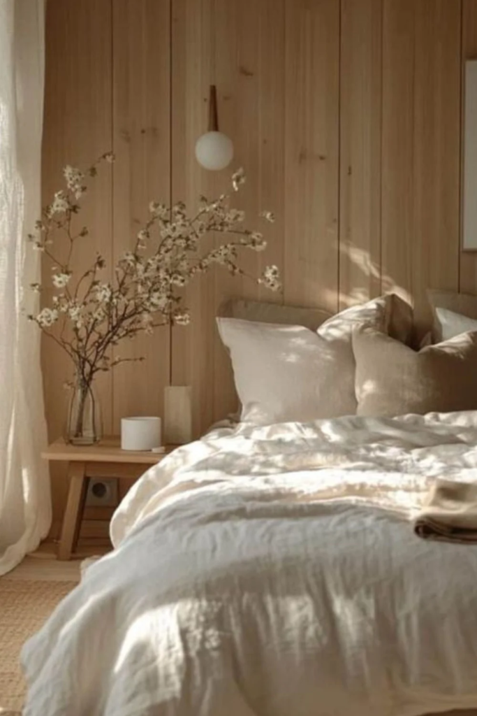 Soft neutral calm is the base of almost every Scandinavian bedroom. Walls in warm white, cream, or very light beige help reflect natural light and make the room feel open even when it is small. This choice is not about being plain. It allows the room to breathe. When you wake up, your eyes are not hit with strong color. Instead, the space feels quiet and steady, which helps the body relax before sleep and wake gently in the morning.