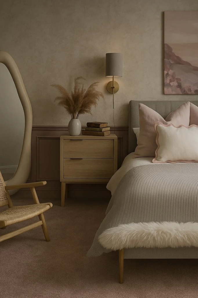 Soft blush balance adds a hint of warmth without breaking the calm. Very light blush tones work well with white, grey, and wood. They bring a gentle glow, especially in bedrooms that lack natural light. In 2026, this soft color choice is often used in bedding or small accents rather than walls.